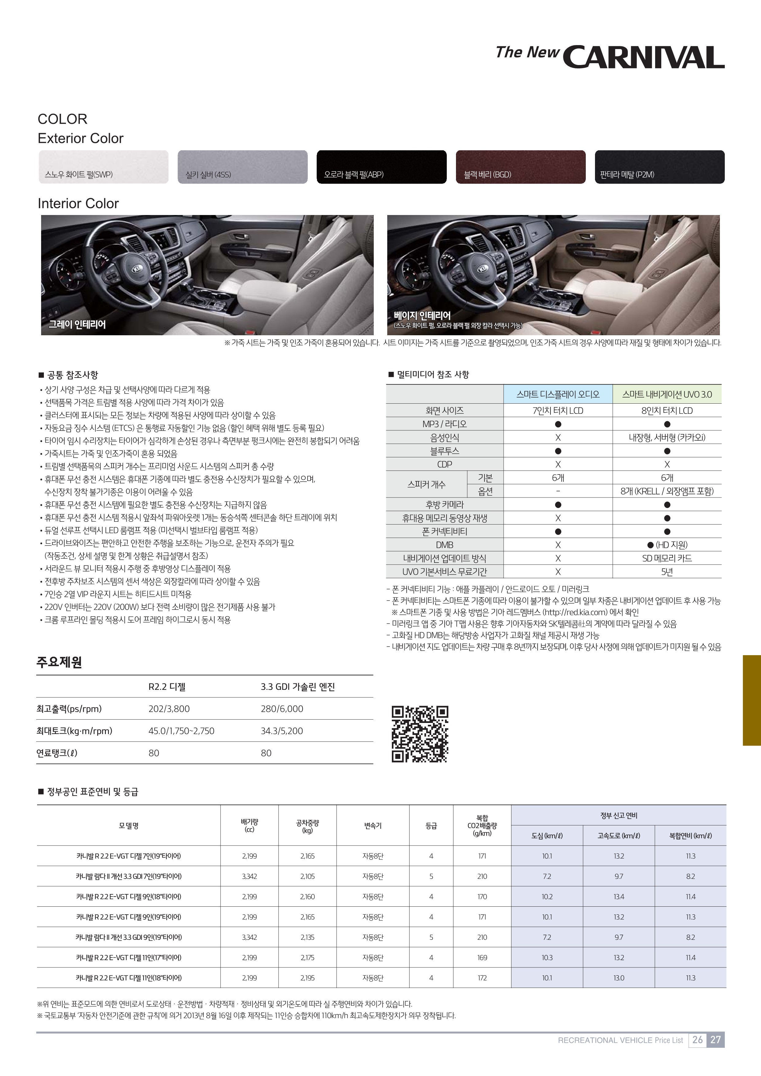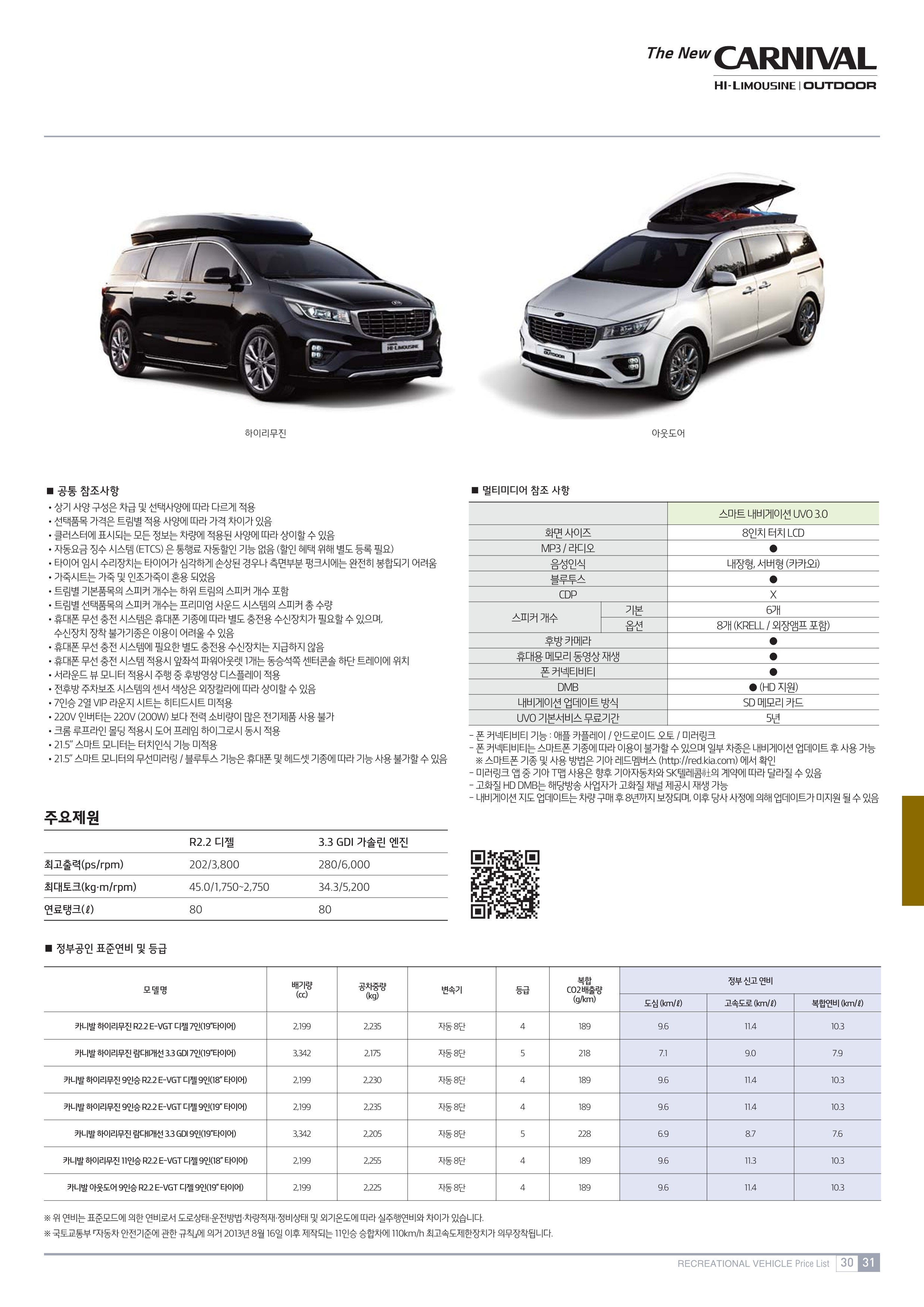 카니발의 파워트레인은 2.2 디젤과 3.3 가솔린으로 나눠지는데요. 2.2 디젤의 경우 4기 통 싱글 터보 엔진과 6단 자동 변속기의 조합으로 최고출력 199마력 / 최대토크 45.0kg.m의 성능을 발휘해요. 그리고 3.3 가솔린의 경우 6기 통 자연흡기 엔진과 6단 자동변속기의 조합으로 최고출력 280마력 / 최대토크 34.3kg.m의 성능을 가지고 있어요. 복합연비는 7.9~11.1km/l의 연료 효율성을 가지고 있네요.