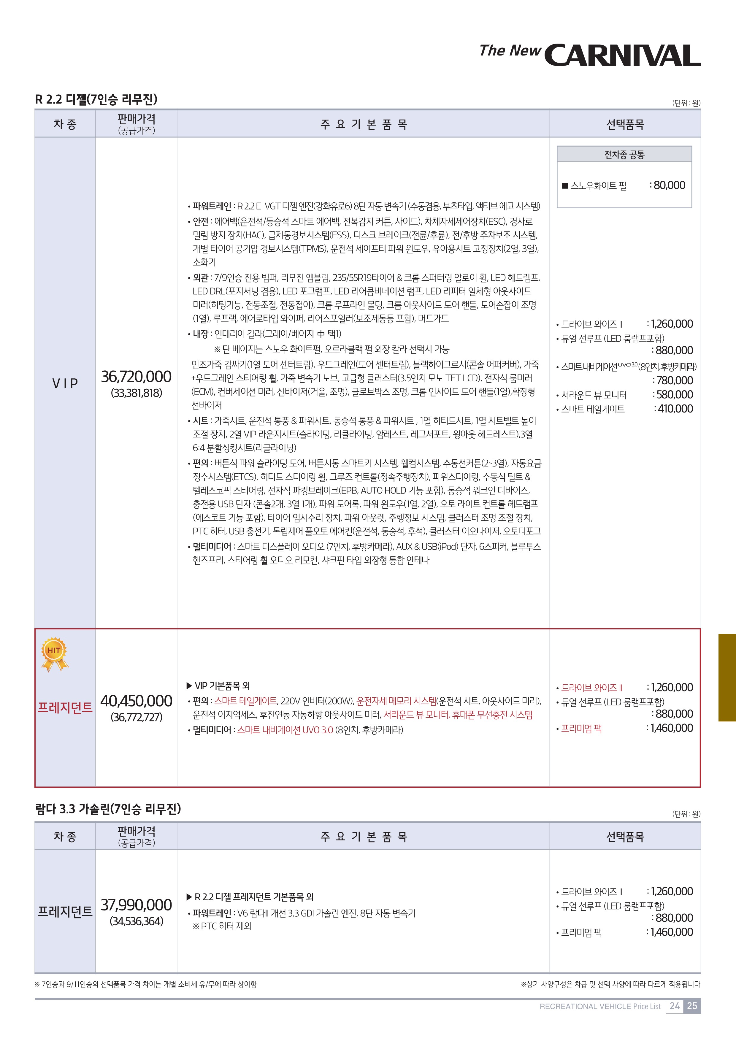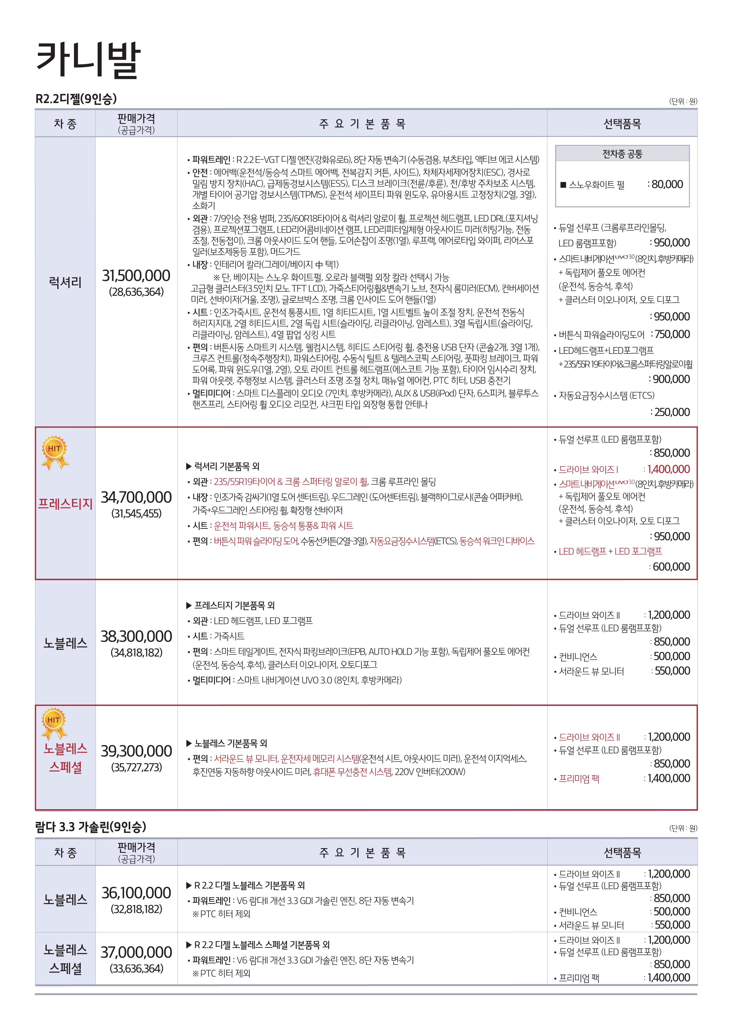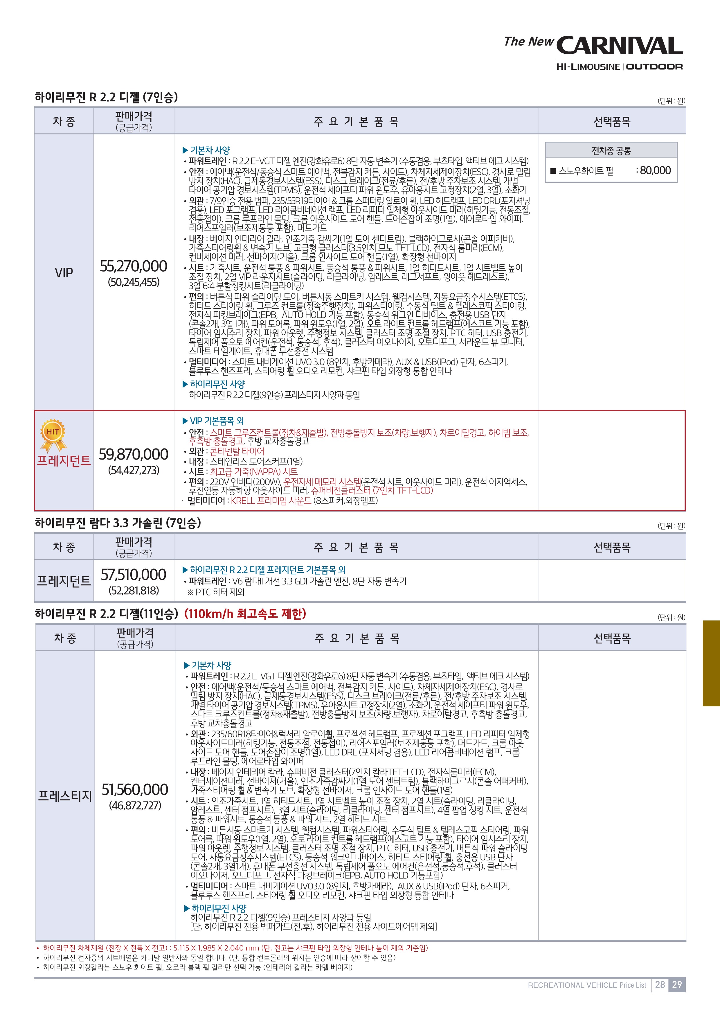 기아자동차 카니발의 판매 가격은 2880만 원~3920만 원으로 책정이 되었는데요. 자세한 가격은 아래의 가격표를 참고하세요.