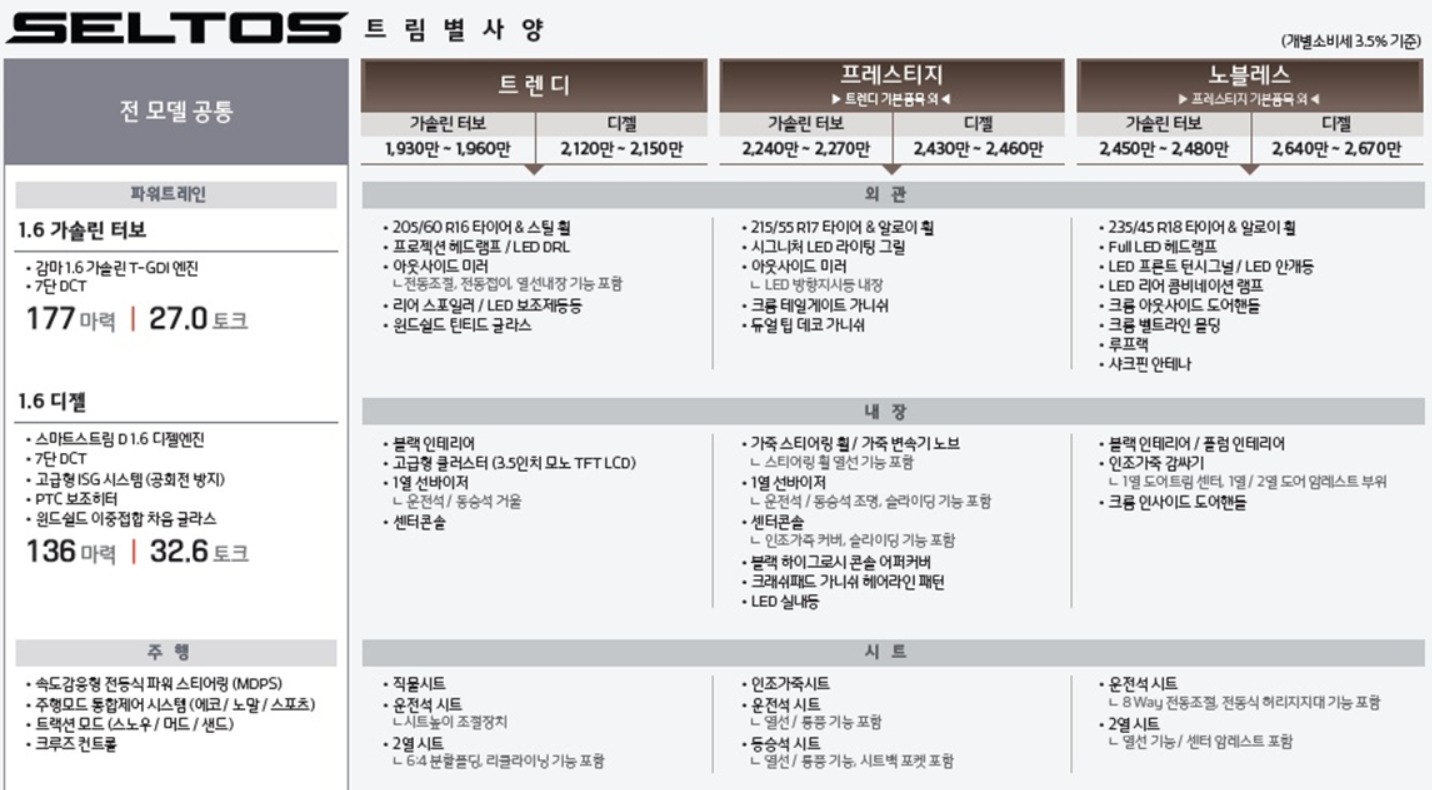 기아자동차 셀토스의 판매 가격은 1.6 가솔린의 경우 트렌디 1930만 원~1960만 원, 프레스티지 2240만 원~2270만 원, 노블레스 2450만 원~2480만 원입니다. 1.6 디젤의 경우 트렌디 2120만 원~2150만 원, 프레스티지 2430만 원~2460만 원, 노블레스 2640만 원~2670만 원으로 책정이 되었습니다. 자세한 내용은 아래의 셀토스 가격표를 참고하세요.