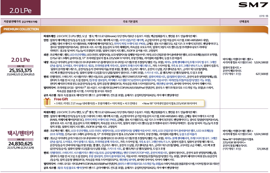 SM7 LPG 모델의 판매 가격은 택시와 렌터카 2483만 원 / 일반인 LPG 2535만 원으로 약 52만 원 정도가 상승하였네요. 그리고 일반용 SM7 LPG 모델에서는 앞좌석 파워시트, 앞뒤 열선시트, 사이드 커튼 에어백, 전후방 경보 장치, 하이패스 시스템이 추가로 적용되었습니다.