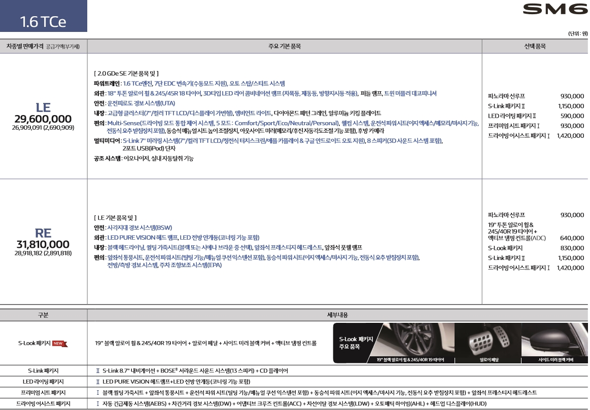 이번에 연식 변경된 SM6는 세련된 스타일 강조하기 위해서 S-LOOK 패키지 옵션을 추가하였는데요. S-LOOK 패키지 옵션의 경우 19인치 블랙 알로이 휠과 사이드미러 커버 그리고 일체형 알로이 스포츠 페달, 액티브 댐핑 컨트롤 등이 새롭게 구성되었습니다. 또한, 5가지 모드와 8가지 핵심 요소를 갖춰 상품성이 더욱 높아졌습니다.
