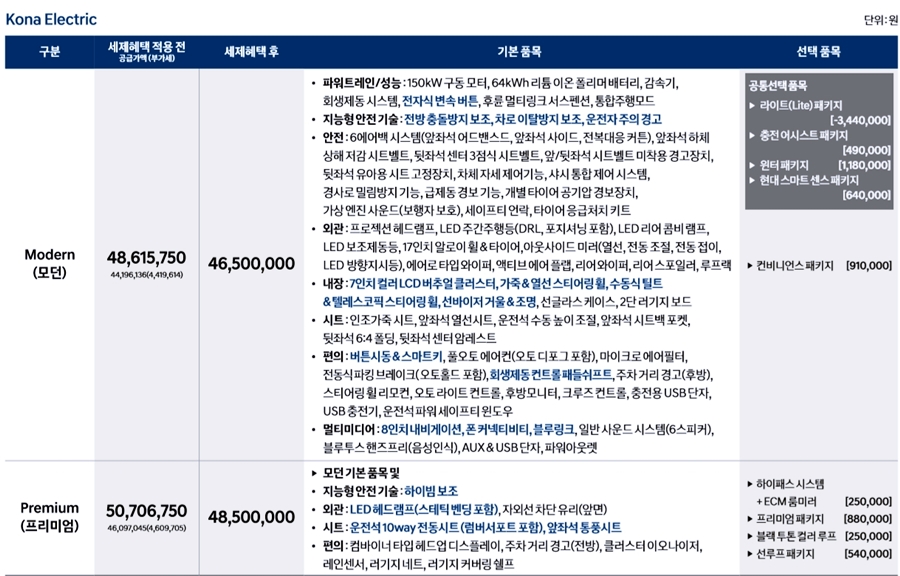 코나 전기차의 판매 가격은 모던 4650만 원, 프리미엄 4850만 원으로 책정이 되었습니다. 자세한 내용은 아래의 코나 전기차 가격표를 참고해주세요.