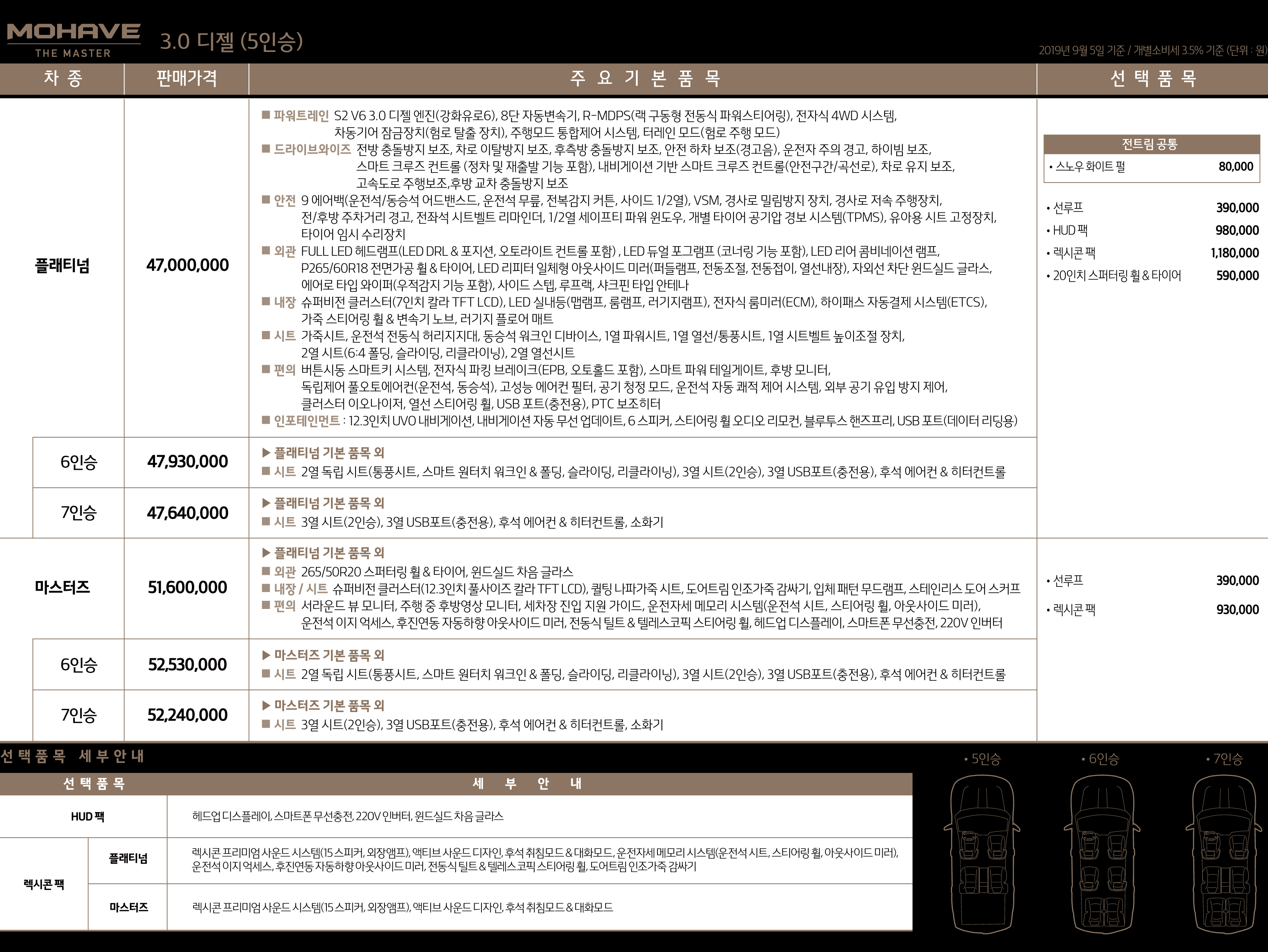 모하비 더 마스터의 트림은 플래티넘과 마스터즈 두 가지 구성으로 출시가 되었고, 플래티넘의 경우 4700만 원~4750만 원으로 책정이 되었으며 마스터즈의 경우 5160만 원~5210만 원으로 책정이 되었습니다. 기존의 모하비 모델보다 많은 부분에서 상품성이 강화되었고, 이로 인해 가격 상승이 조금 있는데요.
