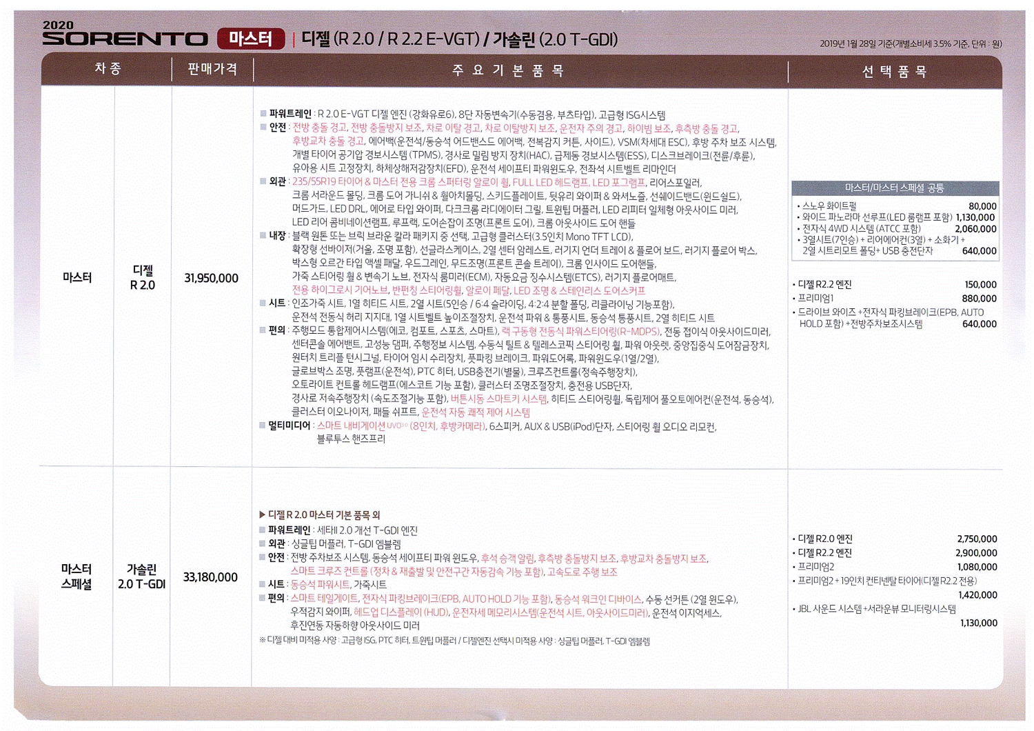 2020 쏘렌토의 판매 가격은 2763만 원~3878만 원으로 책정이 되었는데요. 자세한 내용은 아래의 가격표를 참고하시면 도움일 될 거예요.