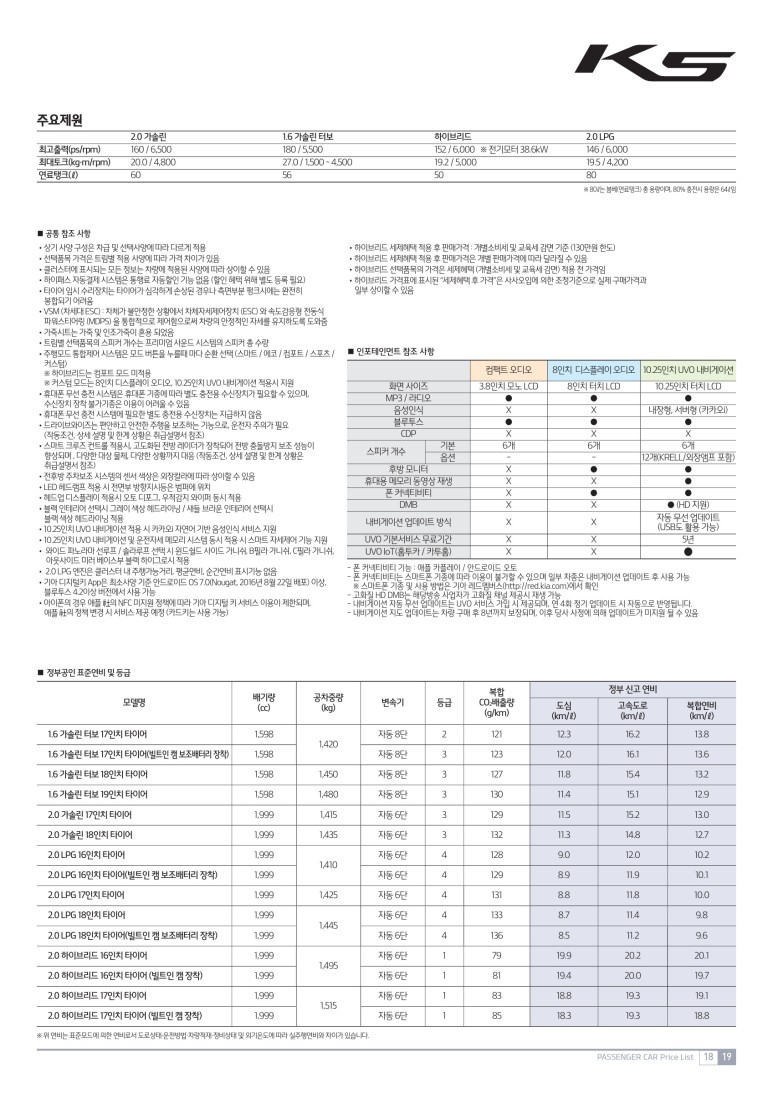 2020년형 K5 풀체인지 하이브리드 모델의 파워트레인은 스마트스트림 G 2.0 HEV 엔진과 6단 자동 변속기가 적용되었습니다. 주행성능은 최고출력 152마력 / 최대토크 19.2kg.m의 성능을 발휘합니다. 복합연비는 19.1~20.1km/l로 1등급의 높은 연료 효율성을 가지고 있습니다.