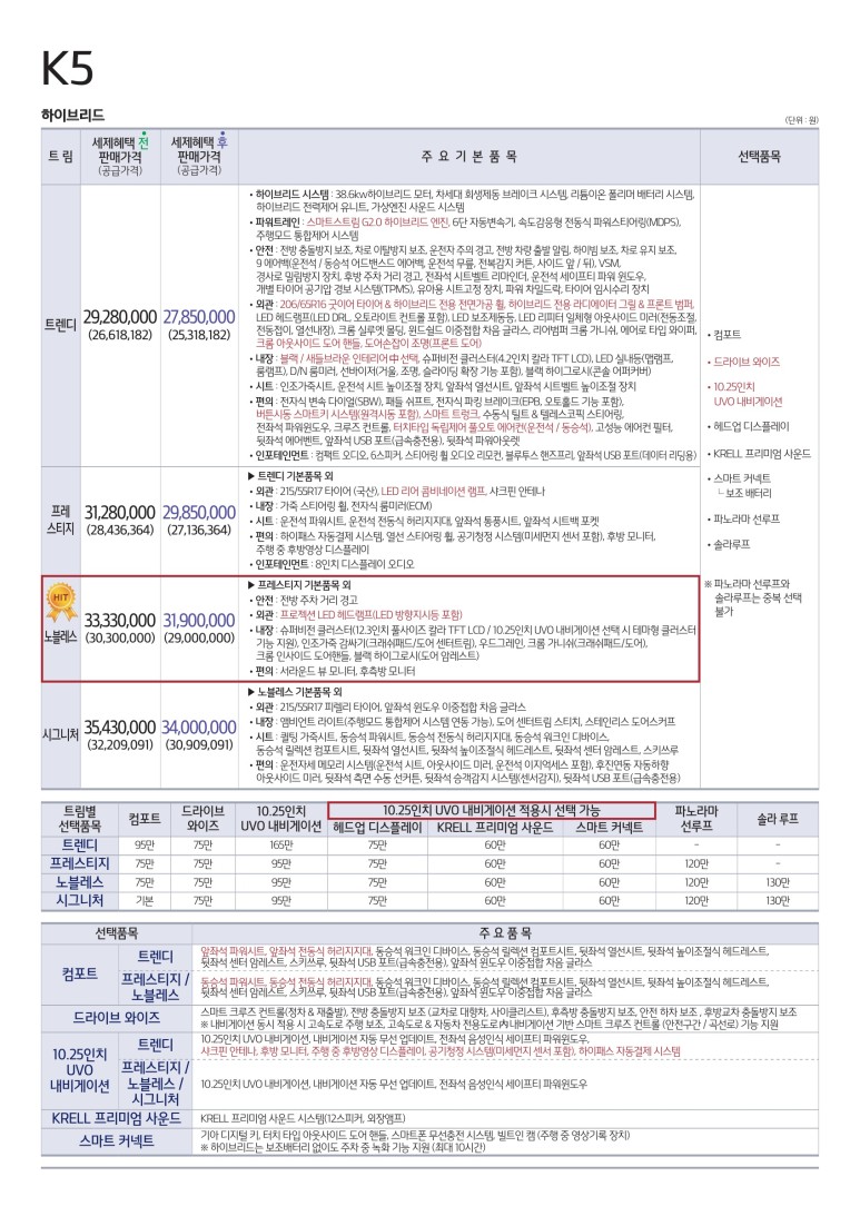 기아자동차 K5 풀체인지 하이브리드 모델의 판매 가격은 2785만 원~3400만 원으로 책정이 되었는데요. 각종 세제 혜택을 받는다면 더욱 경제적으로 차량을 이용해 보실 수 있겠네요. 자세한 가격은 아래의 신형 2020 K5 하이브리드가격표를 참고해주세요.