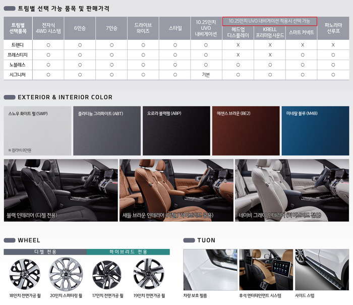 신형 쏘렌토의 컬러는 총 5가지인데요. 스노우 화이트 펄, 플라티늄 그라파이트, 오로라 블랙펄, 에센스 브라운, 미네랄 블루로 구성하고 있습니다. 또한, 실내 인테리어 컬러의 경우 3가지인데요. 블랙, 새들 브라운, 네이비 그레이 이렇게 구성하고 있습니다.