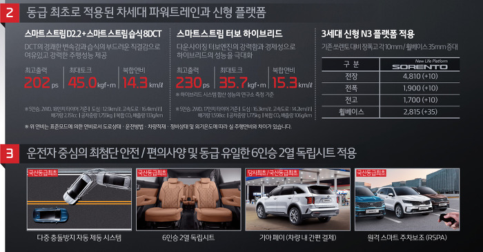 쏘렌토 풀체인지 모델은 사전계약 하루 만에 1만 8800대를 사전계약에 성공하는 역대급의 놀라운 성적을 보였지만, 아쉽게도 하이브리드 인증(정부의 에너지 소비효율 기준 충족 못함)에 실패하여 성공에 찬물을 붓는 당황스러운 일이 생겼습니다. 하지만, 기아자동차에서 잘 헤쳐나갈 것이라 생각됩니다.