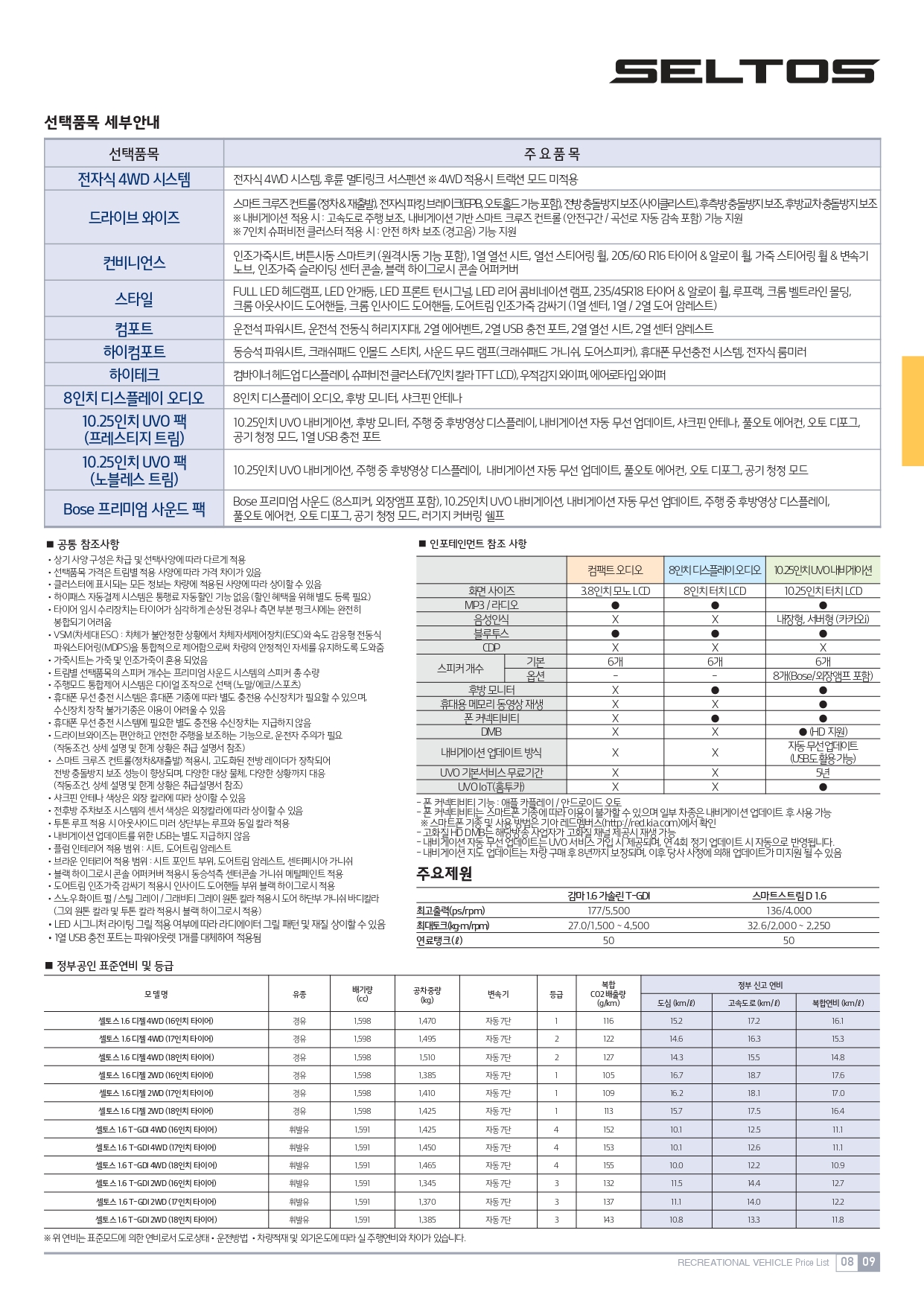 셀토스의 파워트레인은 2가지 구성으로 출시가 되었는데요. 1.6 가솔린 터보와 1.6 디젤로 구성되어 있습니다. 1.6 가솔린 터보의 경우 1.6리터 4기 통 싱글 터보 가솔린 엔진과 자동 7단 변속기의 조합으로 최고출력 177마력 / 최대토크 27.0kg.m의 성능을 발휘해요. 복합연비는 10.9~12.7km/l의 연료 효율성을 가지고 있어요.