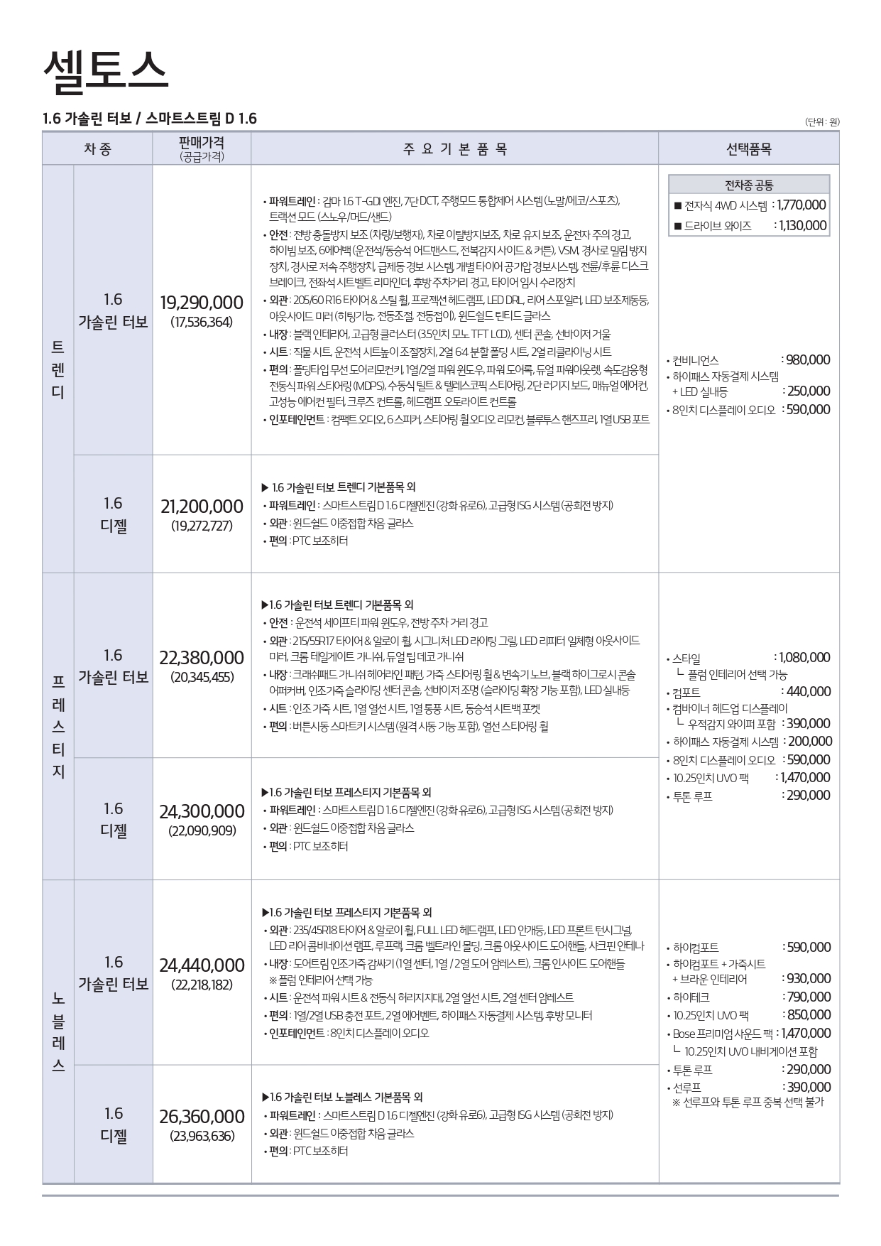 셀토스의 판매 가격은 1929만 원~2813만 원으로 책정이 되었어요. 셀토스는 중고차 방어도 현재까지 잘 되고 있는 것 같네요. 자세한 가격은 아래의 가격표를 참고하세요.