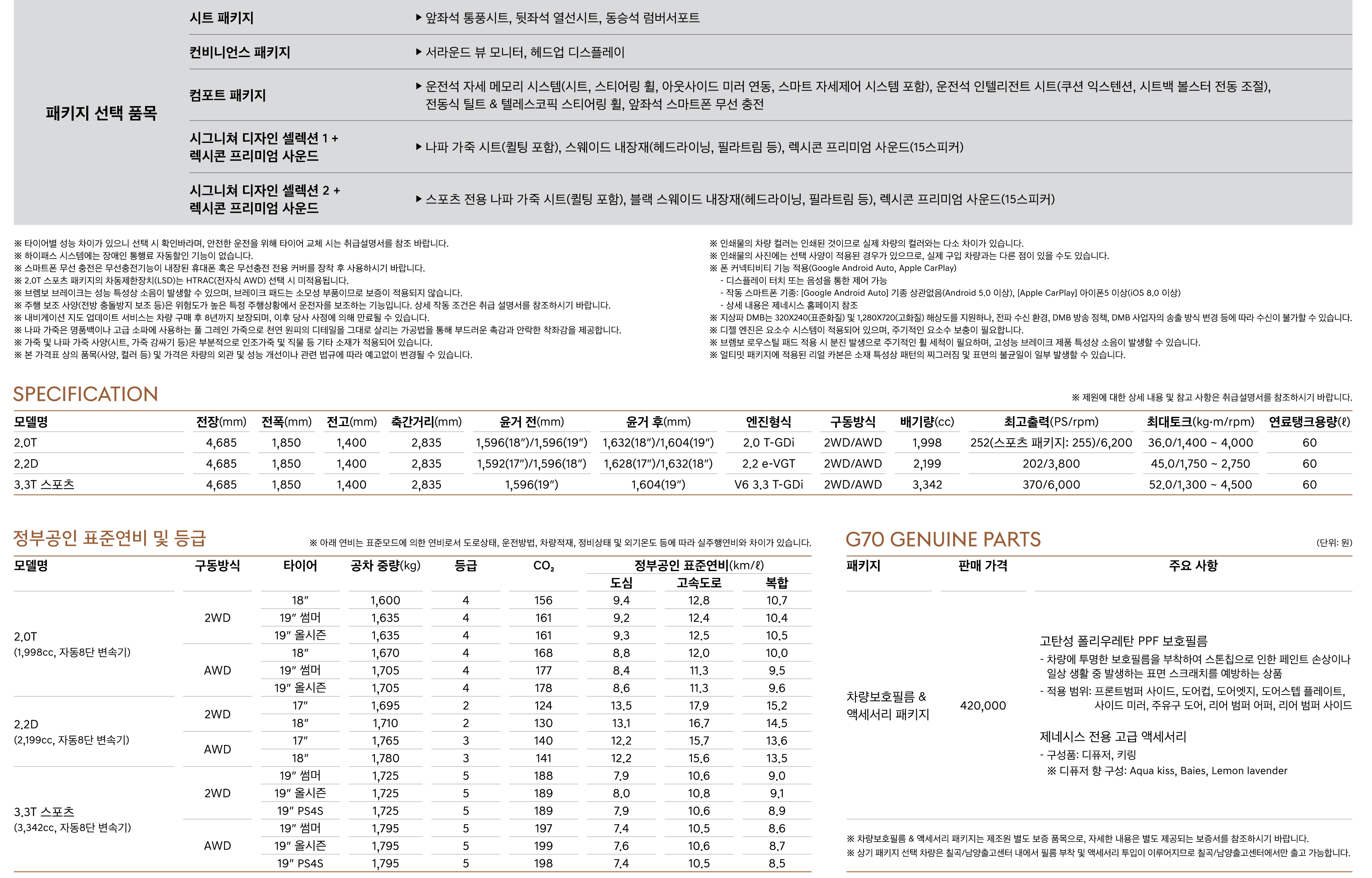 이번 신형 모델의 경우 경제적인 여력이 충분하다면, 3.3 가솔린 터보 모델로 가는 것이 좋지만, 2.0 가솔린 터보 모델에도 많은 신경을 쓴 것 같은데요. 개인적으로 2.0 가솔린 터보 모델도 상당히 매력이 높아진 옵션 사양인 것 같네요. 참고로 제네시스 G70의 복합연비는 8.6~15.2km/l의 연료 효율성을 보여주고 있습니다.