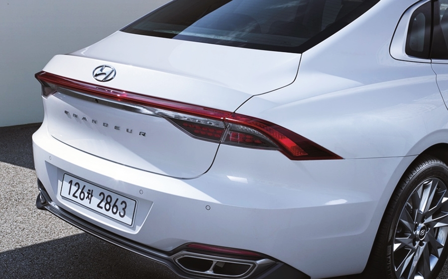 측면부는 중대형 세단의 완벽한 비율이 느껴지네요. 기존 모델에 비해서 40mm나 길어진 휠베이스를 통해 더욱 넓어진 실내를 만나보실 수 있으며, 길어진 휠베이스 덕분에 2열 도어가 조금 커졌기 때문에 탑승하기 더 편리해졌어요. 또한, 헤드램프에서 테일램프로 이어지는 부드러운 캐릭터 라인은 차량의 중후한 느낌을 주기 충분하네요. 18인치 휠이 적용되었는데요. 하이브리드 모델의 특성상 휠의 경우 공기역학적인 디자인으로 다소 밋밋한 디자인이 들어가지만, 그랜저 하이브리드 모델은 날렵한 모습으로 이런 고정관념을 깨버렸어요.