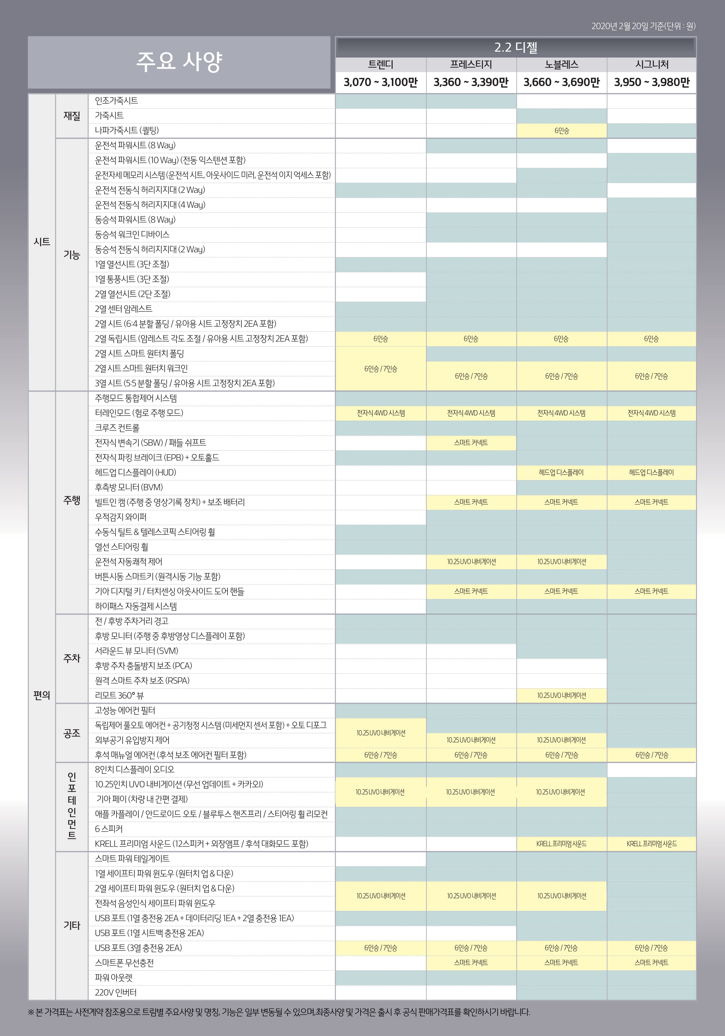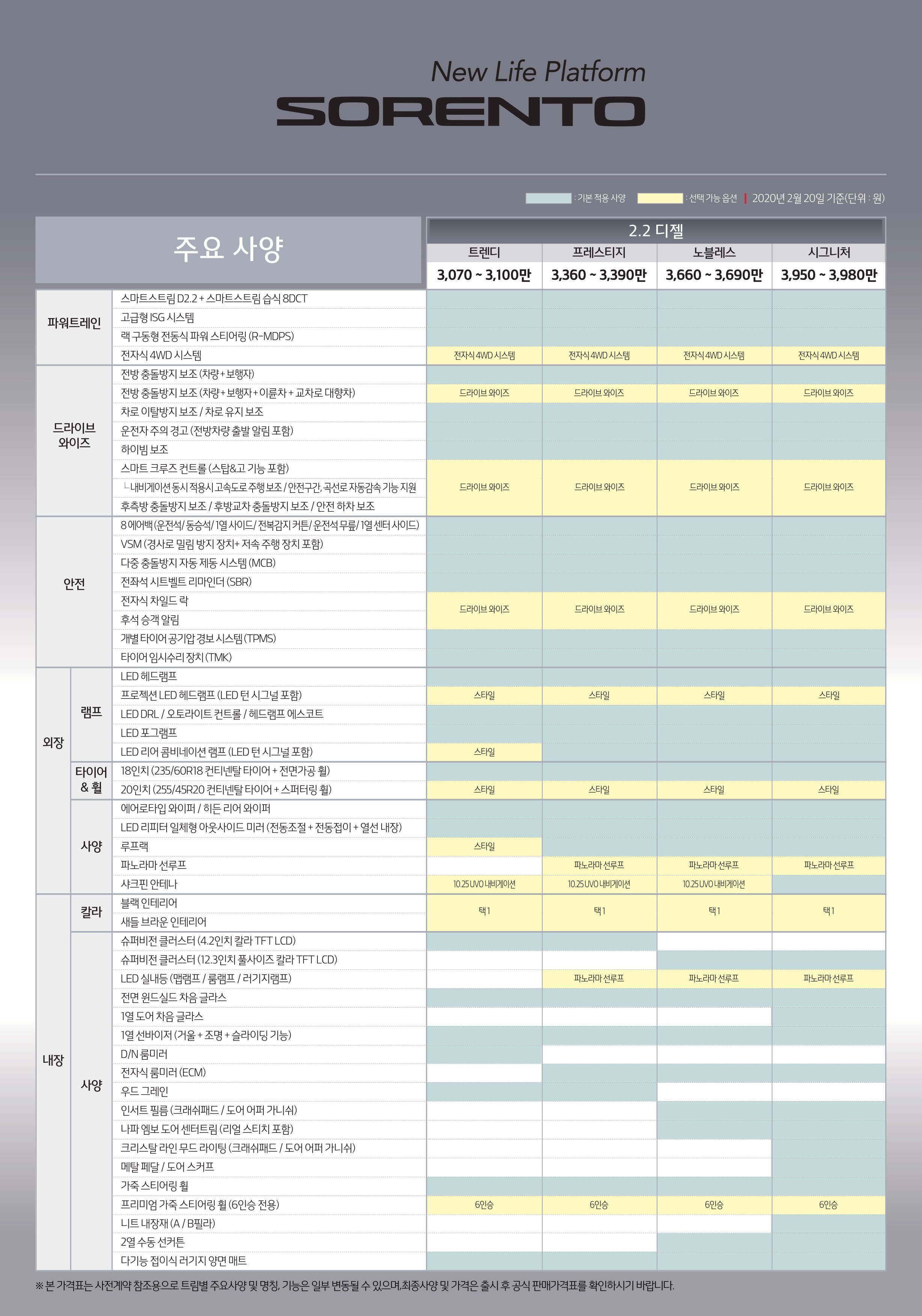 기아자동차에서는 하이브리드 계약은 아직 받지 않고 있으며, 다시 계약하는 시점은 추후에 재공지해 드린다고 하는데요. 디젤 모델의 경우 사전계약을 받고 있습니다. 사전계약 가격표는 아래의 쏘렌토 풀체인지 사전계약 가격표를 참고해주세요.