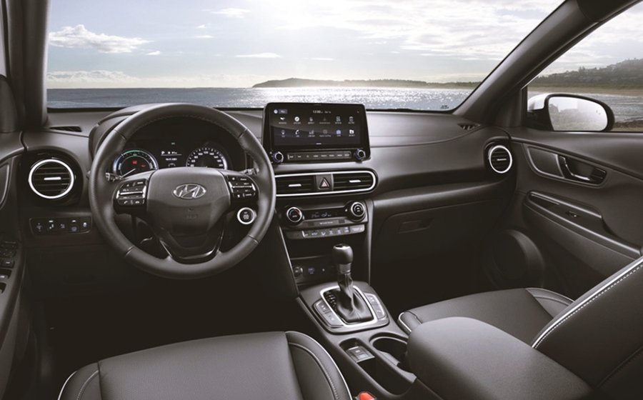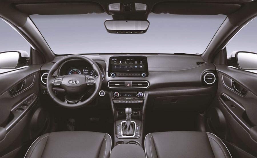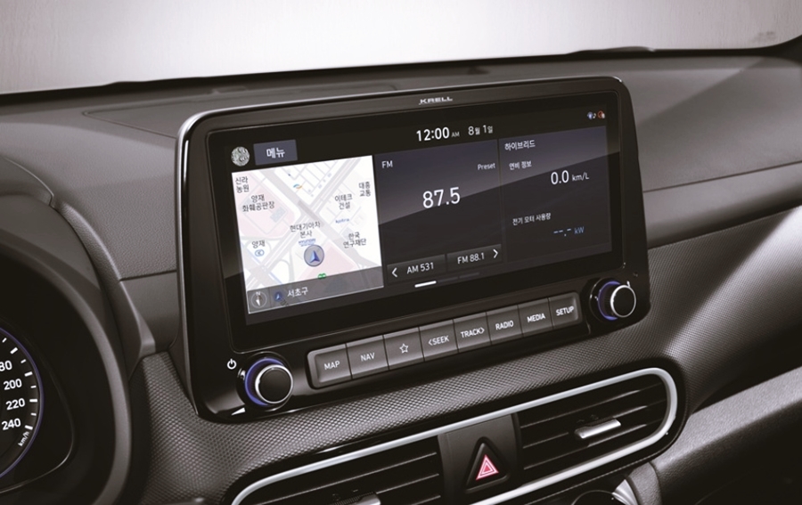 코나 하이브리드 모델에는 10.25인치 고해상도 디스플레이를 적용하여 더욱 넓어진 화면으로 조작의 편리성과 시인성을 동시에 누릴 수 있어요. 또한, 카카오 음성 인식 시스템과 무선 지도 업데이트, 블루투스 2대 동시 연결, 강화된 인포테인먼트 등 더욱 진보된 차량을 만나보실 수 있어요. 그리고 최신 기술인 카투 홈 서비스를 지원하고 있는데요. 이는 차량에서 실시간으로 집 상태를 확인하고 제어할 수 있는 최신 기술이죠.