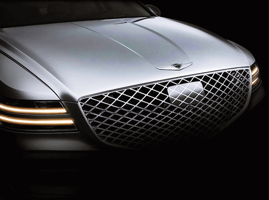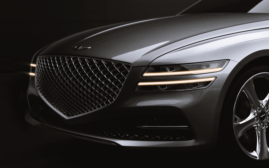 이번 티저 이미지에서는 조금 더 디테일하게 가까이서 전면의 상단 모습을 볼 수 있는데요. 제네시스 엠블럼에서 흘러나오는 듯한 느낌의 후드 디자인과 쿼드 램프의 강렬한 라인, 그리고 중앙의 방패 모형의 매쉬 타입의 고급스러운 라디에이터 그릴은 매력적으로 다가오네요.