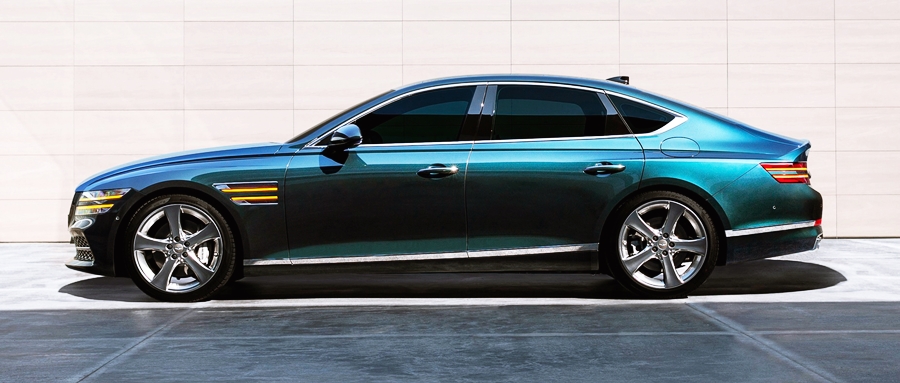 G80은 낮아진 차체로 인해 더욱 날렵한 이미지를 주고 있으며, 제네시스 브랜드의 시그니처가 되어 버린 방패 모형의 크레스트 그릴과 두줄로 전면에서 후면까지 통일성을 주는 쿼드 램프 디자인은 매력적인 G80 풀체인지를 보여주고 있습니다.
