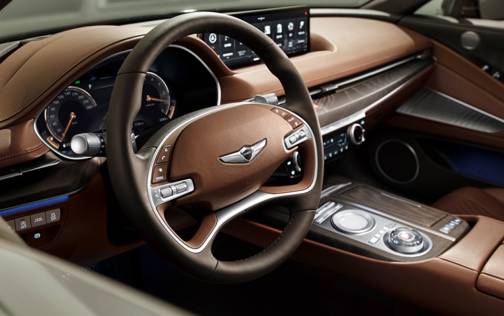 스티어링 휠은 천연 가죽 소재를 사용하여 잡는 촉감이 좋으며, 중앙에는 제네시스를 상징하는 엠블럼이 자리하고 있고, 양쪽으로는 각종 버튼을 삽입하여 더욱 편리한 조작을 하게 만들어 놨고, 테두리 쪽에는 크롬 라인으로 더욱 고급스럽게 장식하였어요. A필러의 두께와 룸 미러 베젤을 축소하고 사이드 미러가 차체에 붙은 플래그 타입의 사이드 미러를 적용하여 더욱 매력적으로 보여요.