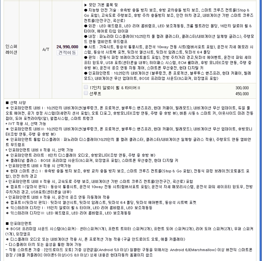 이는 개별소비세 1.5% 기준으로 잡은 가격입니다. 자세한 가격은 아래의 가격표를 참고하시면 도움이 될 것 같네요.