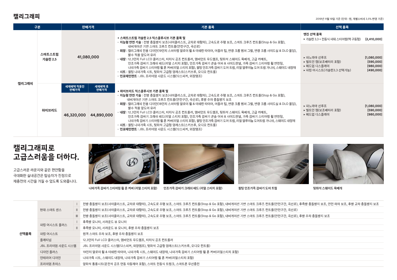 2020 더 뉴 그랜저 하이브리드 모델의 판매 가격은 프리미엄 3740만 원 / 프리미엄 초이스 3815만 원 / 익스클루시브 4090만 원 / 캘리그래피 4575만 원으로 책정이 되었습니다. 자세한 가격은 아래의 가격표를 참고하시면 도움이 될 것 같습니다.