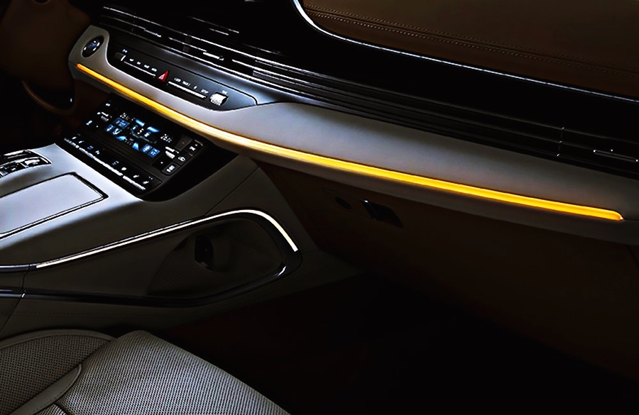 실내의 경우 고급스러운 느낌으로 마치 고급 라운지로 돌아와서 느낄 수 있는 안락한 공간이 생각납니다. 길게 뻗은 수평적 대시보드와 가죽 소재를 적극 사용하여 고급스러운 느낌을 줌과 동시에 스웨이드 소재를 사용하여 럭셔리한 플래그십 세단의 품격을 보여주고 있습니다.