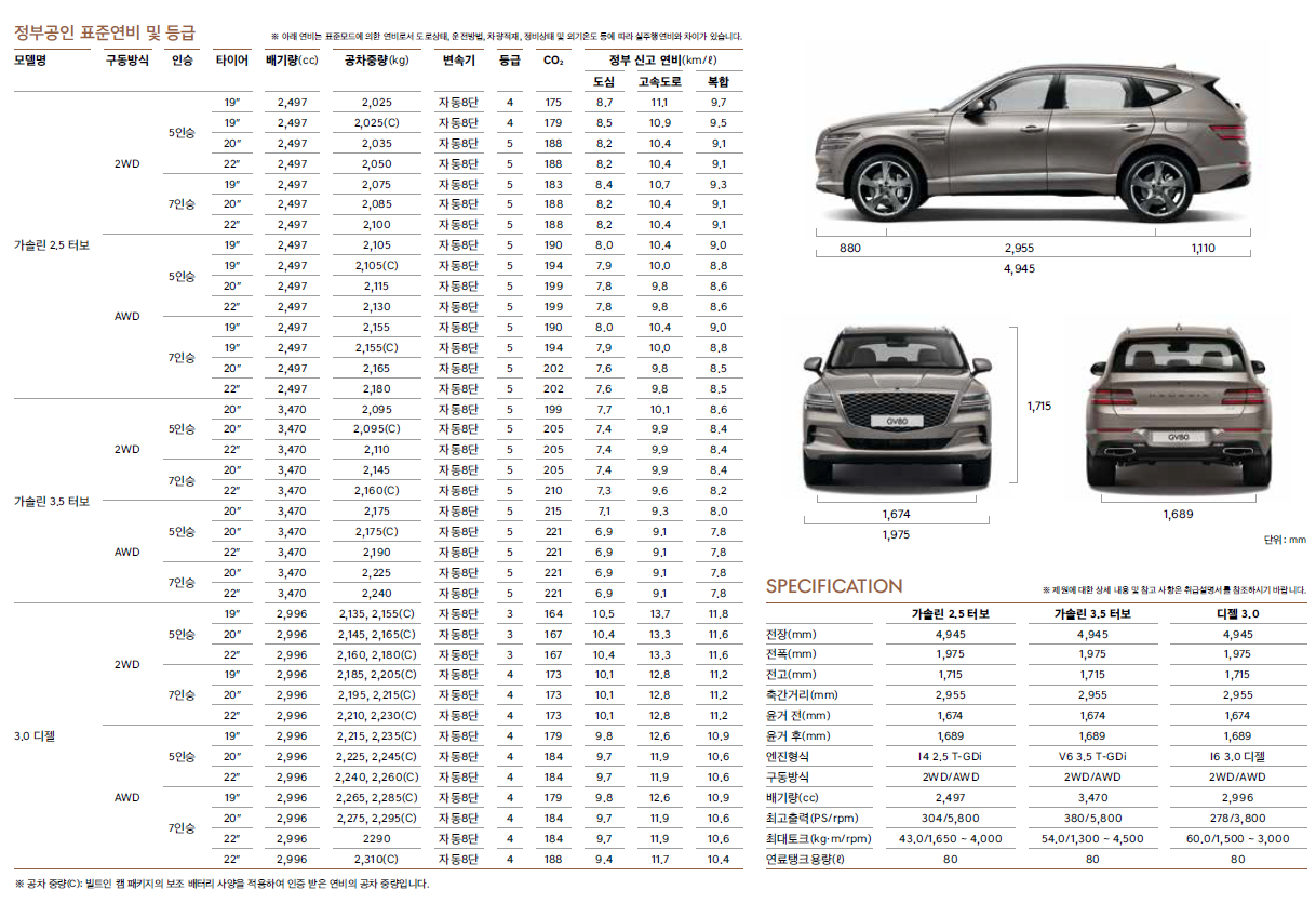 2.5 가솔린 터보의 경우 최고출력 304마력 / 최대토크 43.0kg.m의 성능을 발휘합니다. 3.5 가솔린 터보의 경우 최고출력 380마력 / 최대토크 54.0kg.m의 성능을 발휘합니다.