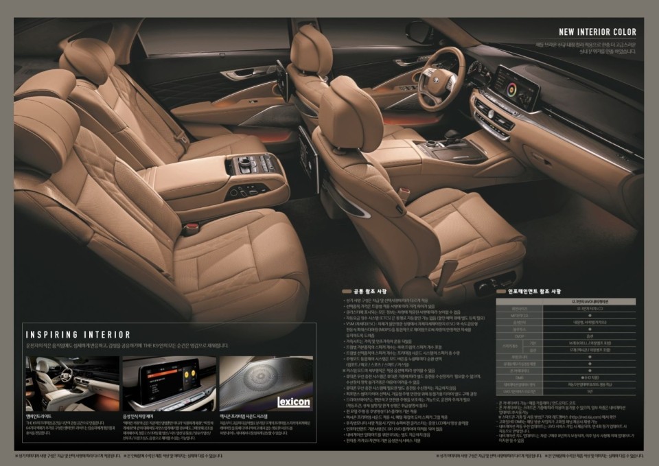 2021년형 THE K9 모델은 편의사양을 추가하고 트림을 조정했다고 하는데요. 내장 라인업에는 새들 브라운 컬러를 도입하였고, 실내에는 감성을 불러일으키는 엠비언트 라이트의 범위를 늘려 많은 고객들이 선택할 수 있도록 하였습니다.