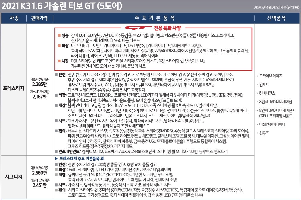 2021년형 K3 GT 모델의 경우 프레스티지와 시그니처라는 두 가지 트림만 운영을 하고 있으며, K3 GT의 경우 기존 상위 트림에서 선택할 수 있었던 부분을 프레스티지 트림에서도 선택할 수 있게 만들었습니다.