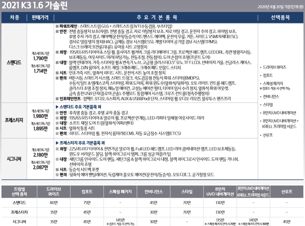 K3 2021 모델의 트림으로는 스탠다드, 프레스티지, 시그니처로 세 가지 트림만 제공이 되고 있는데요. 트림이 적으면 소비자 입장에서는 더욱 편안한 선택을 할 수 있죠.