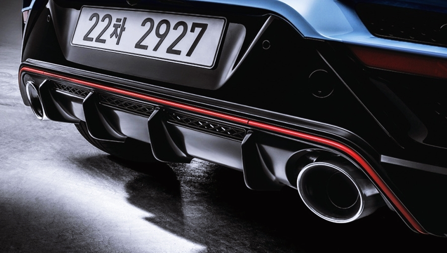 리어 범퍼 하단에는 전면 측면 후면에서 보였던 붉은 라인을 넣어서 스포티한 느낌과 동시에 통일성을 느낄 수 있으며, 디퓨저는 핀 형식으로 고성능 자동차의 느낌이 들어, 또한, 원형의 듀얼 머플러까지 고성능을 상징하는 자동차답게 멋진 모습을 보여주네요.