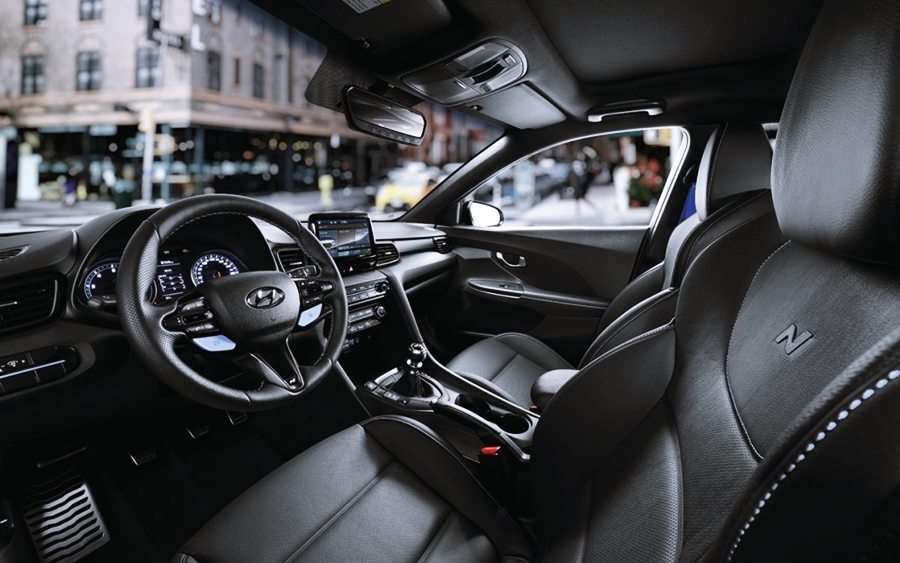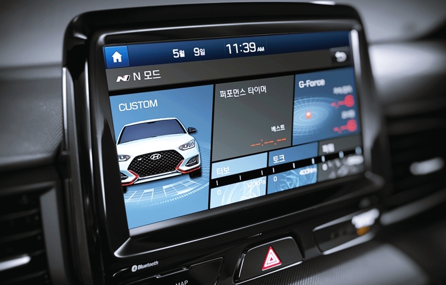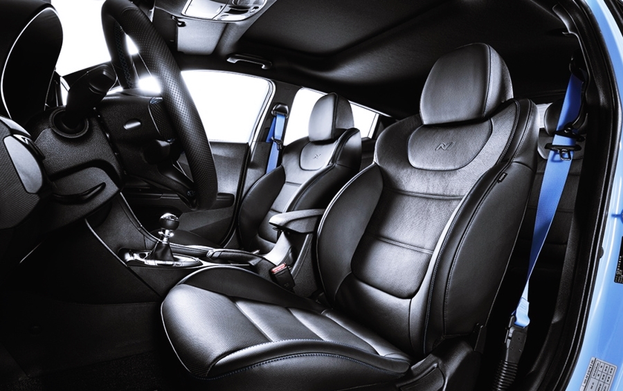 손에 감기는 느낌을 주는 스티어링 휠과 플로팅 타입의 8인치 내비게이션, 스티어링 휠, 시트, 사이드 몰딩에는 N라인을 상징하는 로고가 넣어져 있네요.