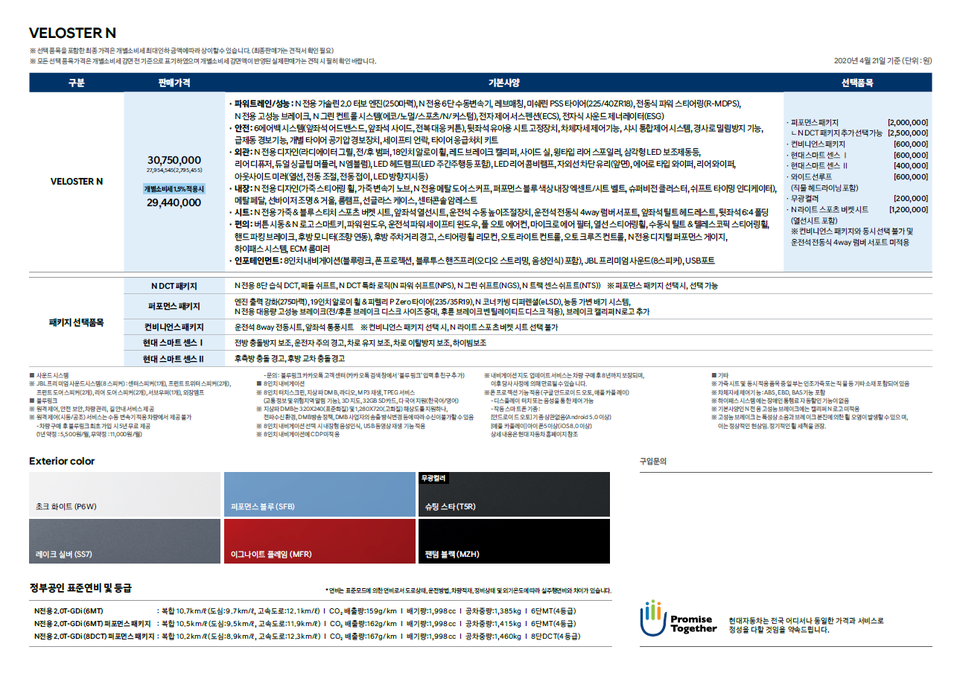 2020년형 벨로스터 N의 판매 가격은 2944만 원~3394만 원으로 책정이 되었는데요. 자세한 가격은 아래의 가격표를 참고해주세요.