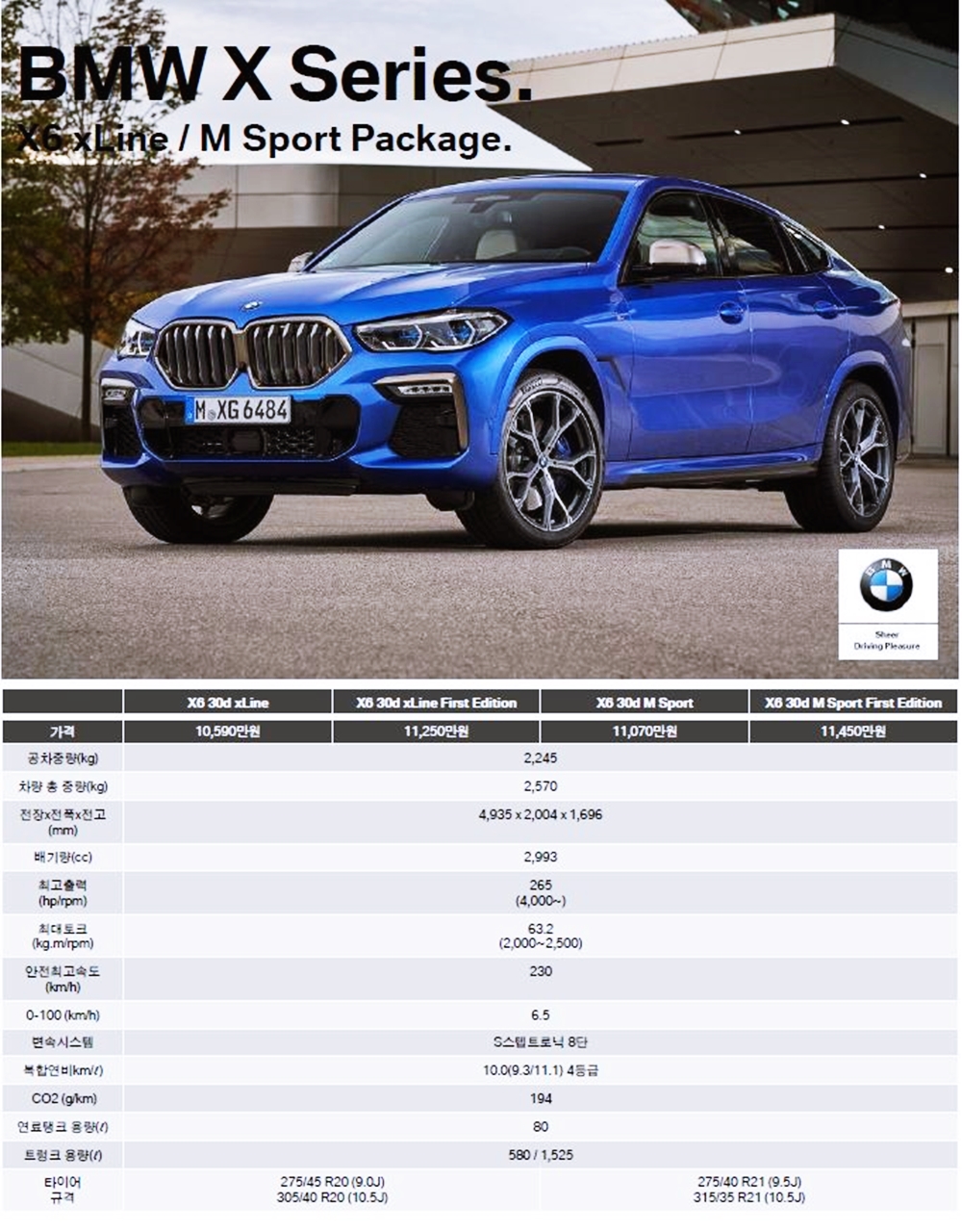 BMW X6 풀체인지 모델의 가격은 1억 0560만 원~1억 5200만 원으로 책정이 되었어요. 자세한 가격은 아래의 가격표를 참고해주세요.