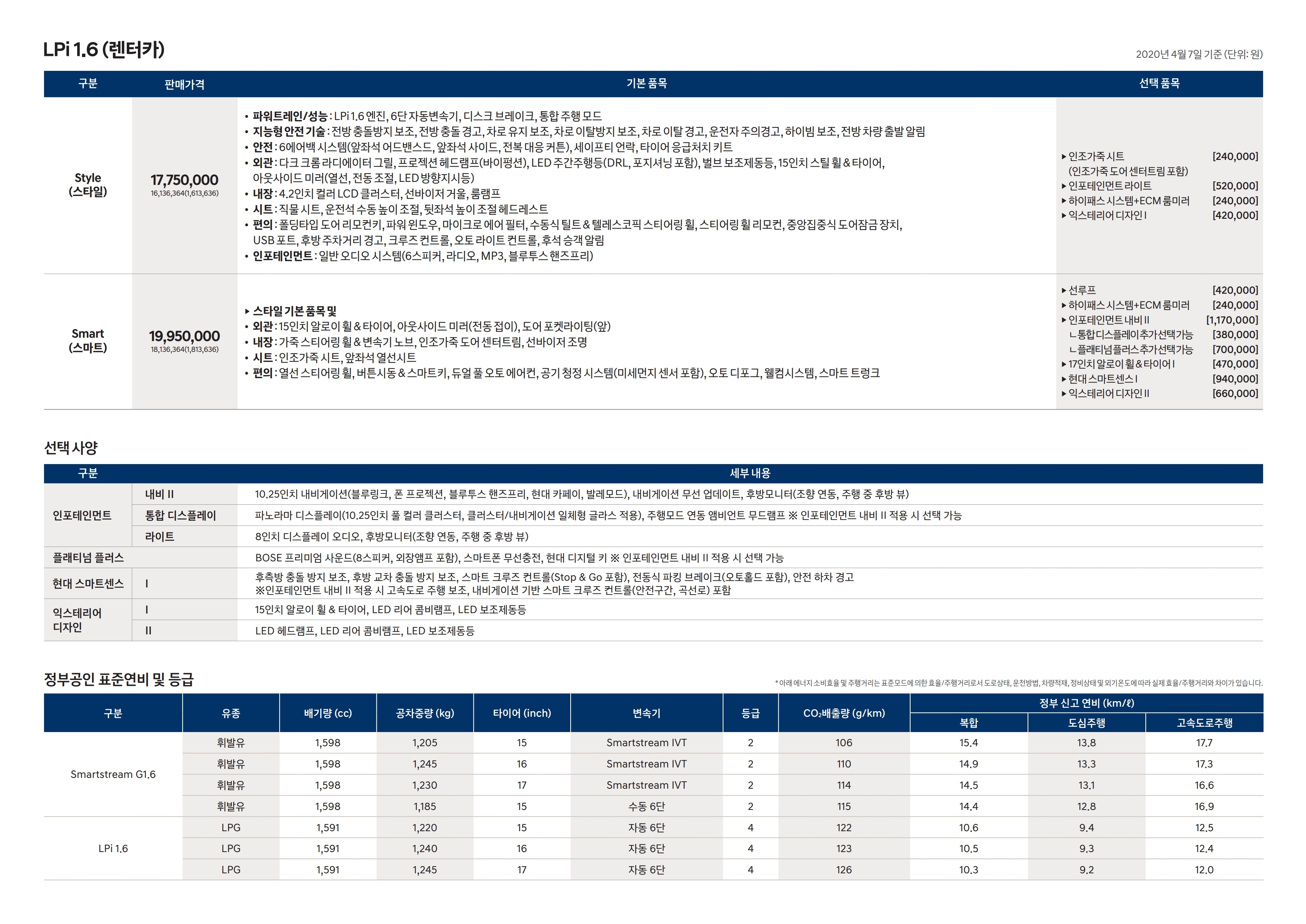 그리고 1.6 LPI 엔진의 경우 1.6리터 4기 통 자연흡기 LPG 엔진과 자동 6단 변속기의 조합으로 최고출력 120마력 / 최대토크 15.5kg.m의 성능을 보여줘요. 복합연비는 10.5~10.6km/l의 연료 효율성을 보여주는데요. lpi 엔진을 사용하면서 10km/l 이상의 연료 효율성이라고 한다면, 정말 대단한 것 같네요. 이 역시 기술의 발전이 아닌가 싶네요.