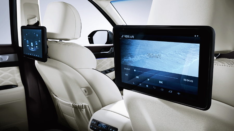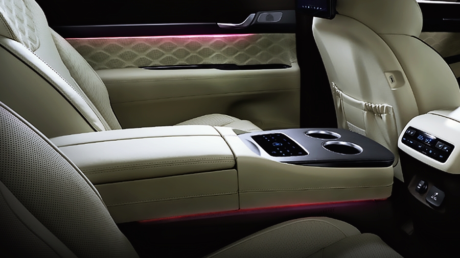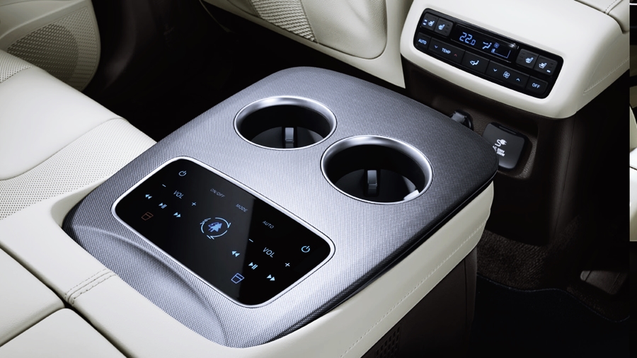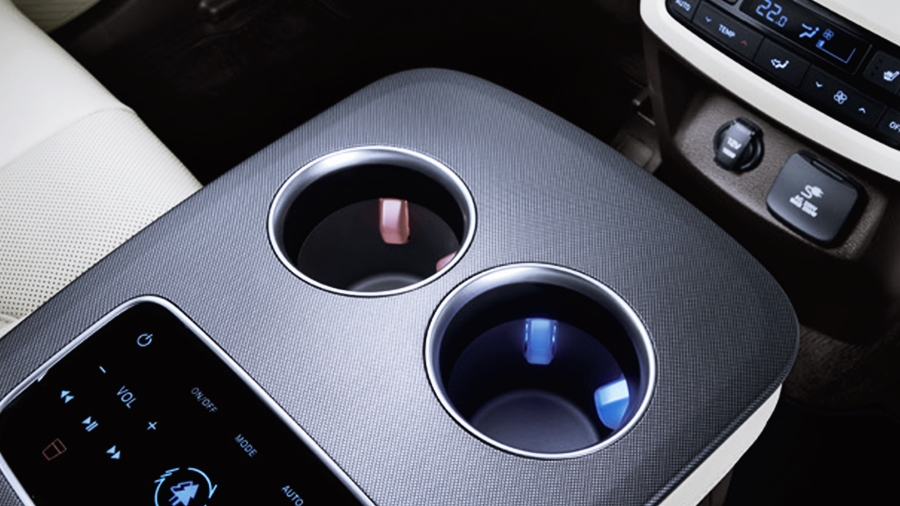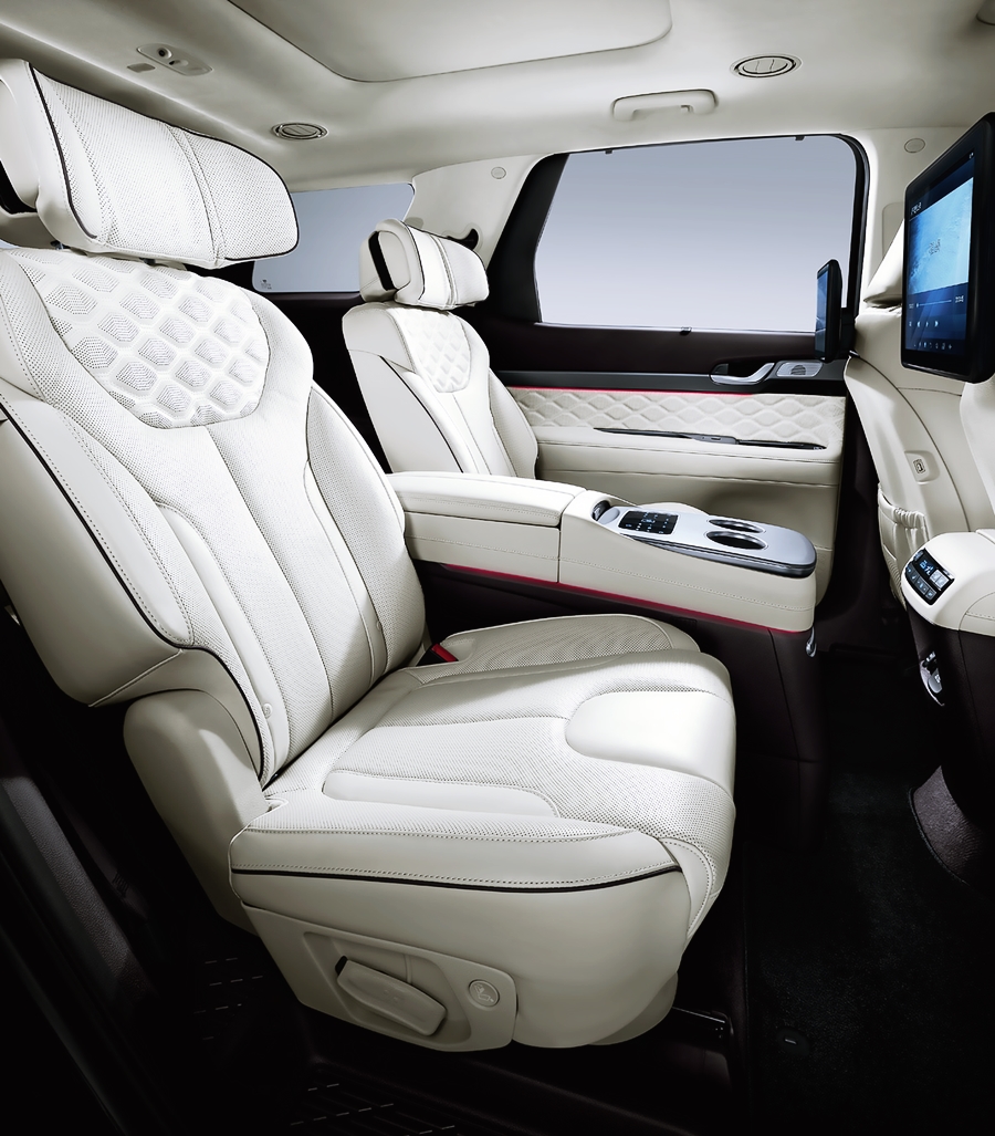 VIP 모델의 경우 공기 청정기와 냉, 온 기능을 사용할 수 있는 컵홀더가 콘솔 암레스트에 적용되었고, 뒷좌석에서 시청이 가능한 2대의 모니터를 적용하여 더욱 럭셔리한 뒷좌석을 만나보실 수 있습니다. 또한, 편안하게 충전을 할 수 있는 스마트폰 무선 충전기를 2열에 적용하면서 편리한 충전을 가능하게 하였으며, 스피커 내장형 윙타입 헤드레스트 등을 적용하여 1열뿐만 아니라 2열에서도 충분히 안락하고 편안하게 만든 VIP모델입니다.