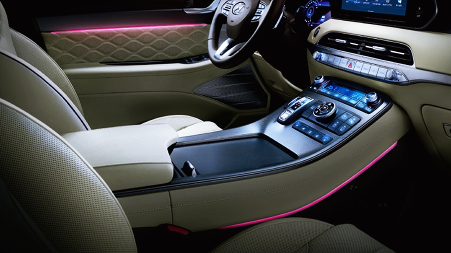 캘리그래피에는 앰비언트 무드 램프 퀼팅 나파 가죽 시트, 퀼팅 가죽을 활용한 도어 트림, 반 펀치 가죽 스티어링 휠 등을 적용하면서 더욱 내부의 고급스럽게 장식하였습니다.