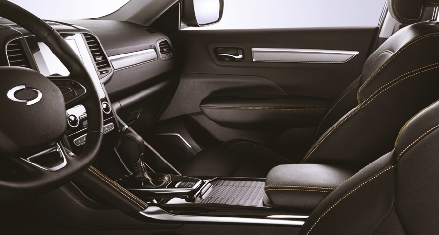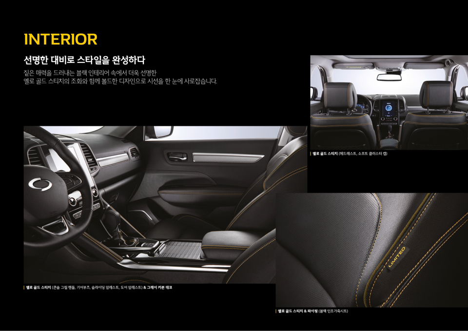 QM6 볼드 에디션의 실내 인테리어는 기본으로 옐로 골드 컬러가 적용되었고, 인조가죽시트부터 헤드레스트, 앞좌석 슬라이딩 암레스트 및 도어 암레스트, 기어 부츠, 카매트에 옐로 골드 스티치, 콘솔 그립 핸들, 소프트 클러스터 캡 등을 추가하여 더욱 특색 있는 차량을 만들었어요.
