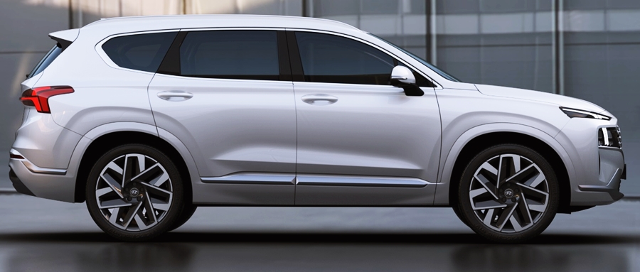 측면에서는 신규 플랫폼을 적용한 것이 확 티가나는 모습입니다. 아무래도 신형 쏘렌토에 들어간 신규 플랫폼이 적용되어 기존보다 긴 전장을 보여줍니다. 기존의 싼타페의 날렵한 사이드 캐릭터 라인을 유지하면서도 깔끔한 굴곡 라인은 매력적입니다. 또한, 20인치 휠이 역동적인 느낌을 주며 한층 더 멋있는 싼타페 페이스리프트 모델을 만들어준 것 같네요.