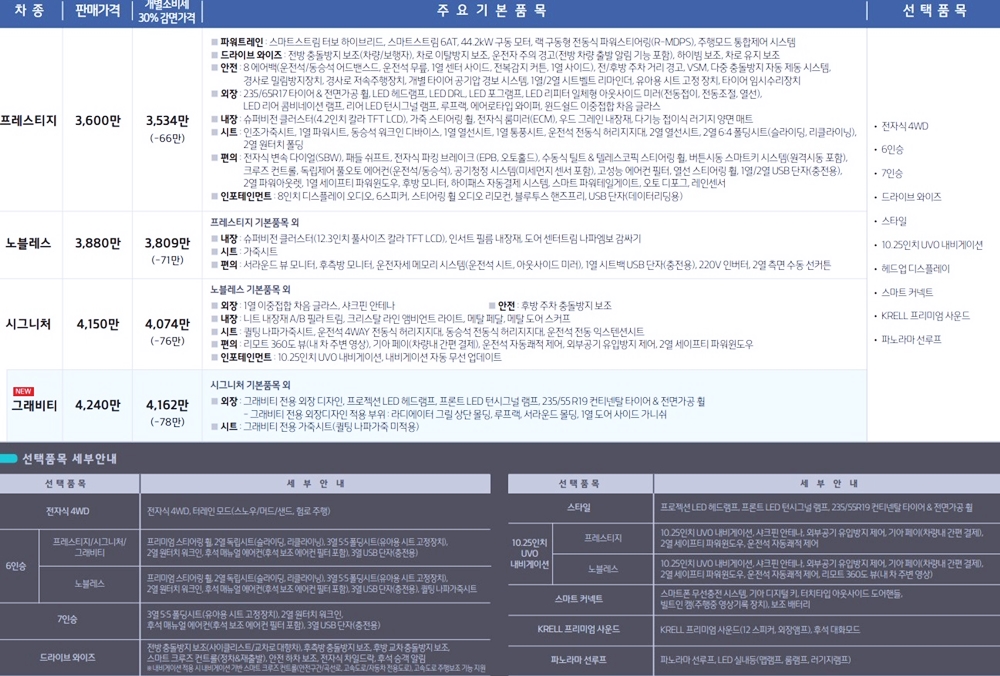쏘렌토 하이브리드의 판매 가격은 프레스티지 3534만 원 / 노블레스 3809만 원 / 시그니처 4074만 원 / 그래비티 4162만 원으로 책정이 되었습니다.(이는 개별소비세 3.5%를 기준으로 잡은 가격입니다.) 기존보다 약 50만 원 정도의 상승이 있네요. 자세한 쏘렌토 하이브리드의 판매가격은 아래의 쏘렌토 하이브리드 가격표를 참고하시면 도움이 될 것 같아요.