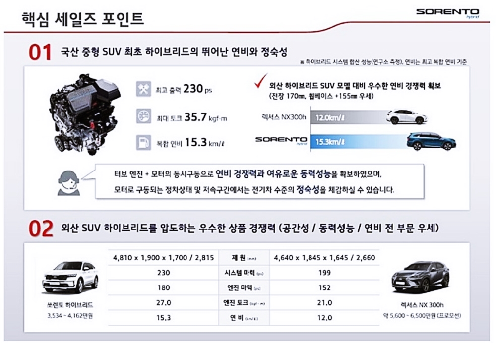 쏘렌토는 사전계약 첫날 1만 8941대라는 최고치의 사전계약을 이뤘으며, 그중 하이브리드 모델이 무려 1만 2212대로 64%에 달하는 비중으로 선전하였습니다.