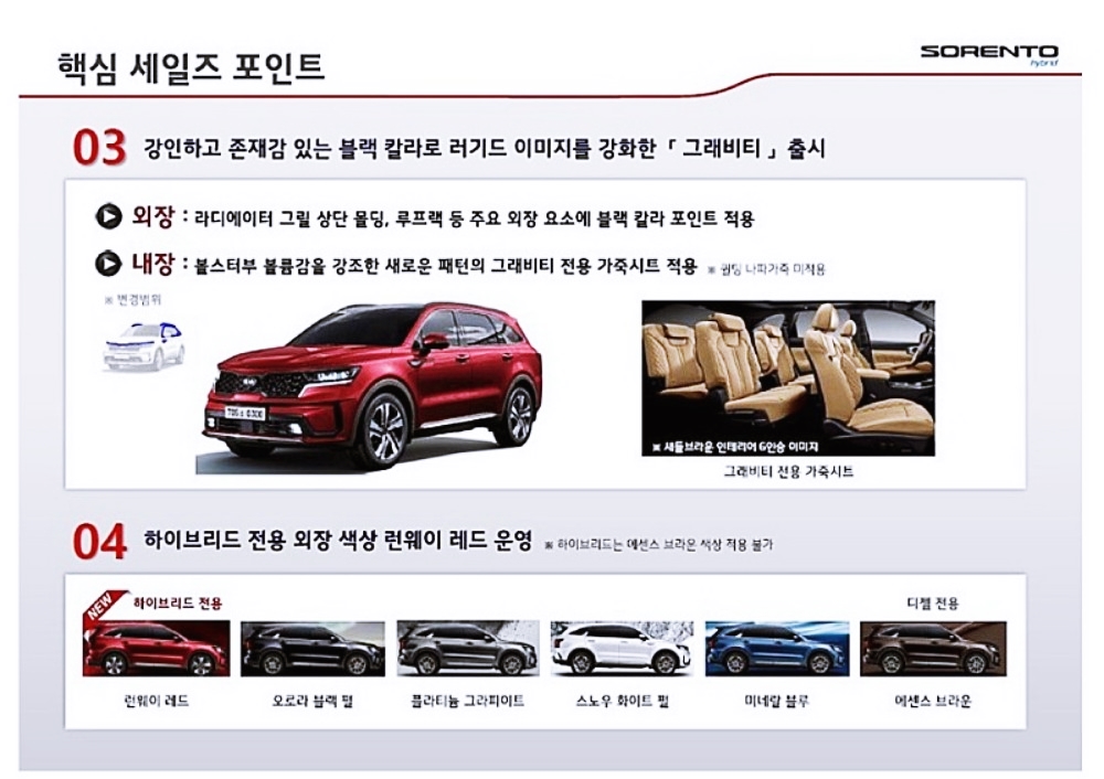실내에서는 그래비티 전용 가죽시트를 적용하여 더욱 고급스러운 느낌과 동시에 안락한 승차감을 가지고 있어요. 또한, 외장 컬러 런웨이 레드를 새롭게 적용하여 운영한다고 하는데요. 이번 쏘렌토 하이브리드 출격을 위해 많은 준비를 한 것이 보이네요.