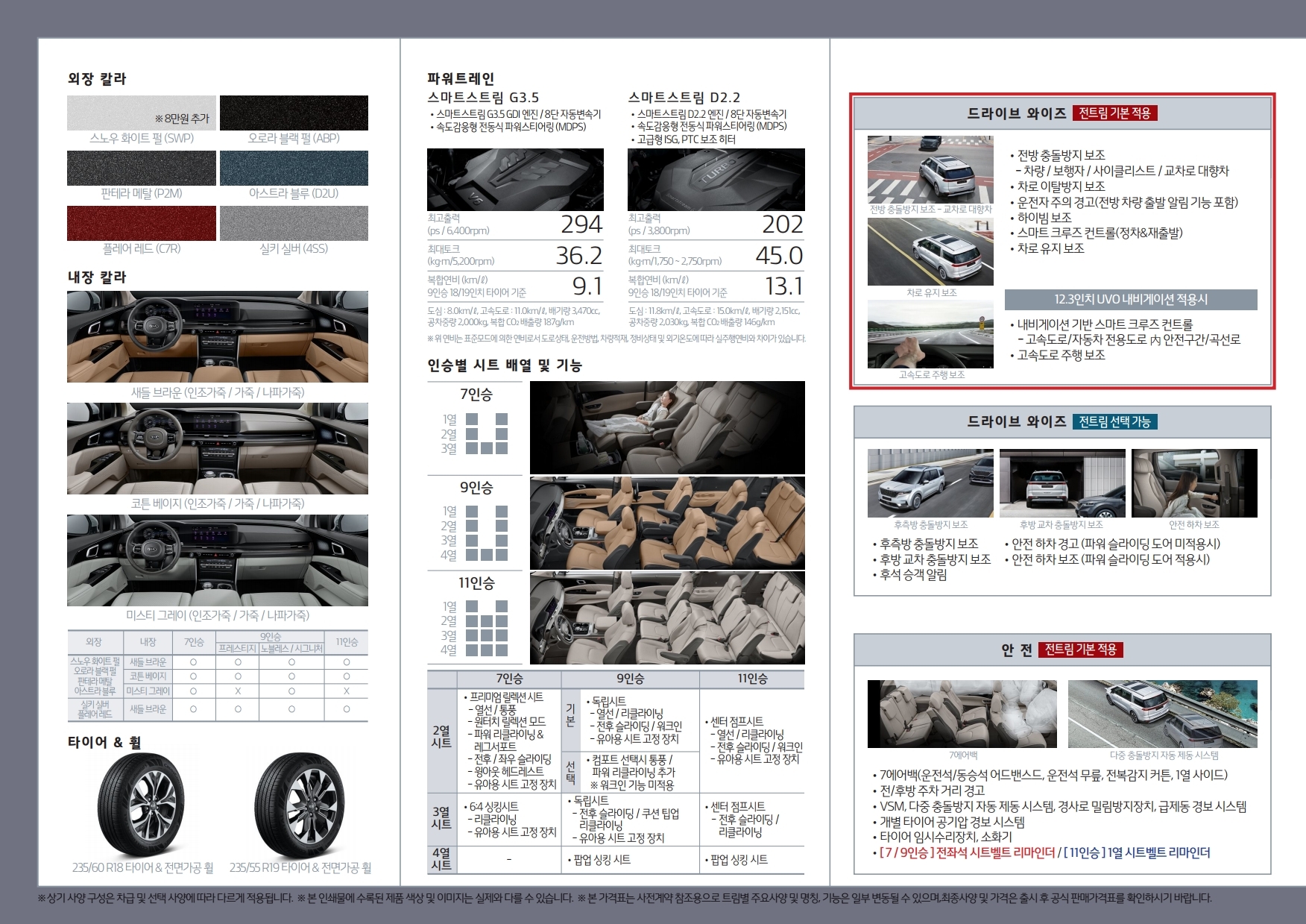신형 카니발의 파워트레인은 2가지로 구성하고 있는데요. 가솔린 3.5리터 엔진과 디젤 2.2 엔진으로 구성하고 있습니다. 실용성이 높은 차량이기 때문에 어떤 파워트레인을 선택해도 좋을 것 같네요. 차량 승차 인원은 7인승 9인승에 11인승까지 필요하신 분의 상황에 맞게 선택하시면 될 것 같네요.