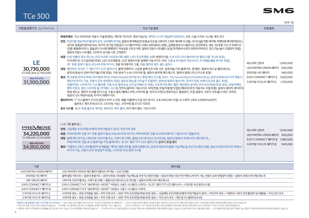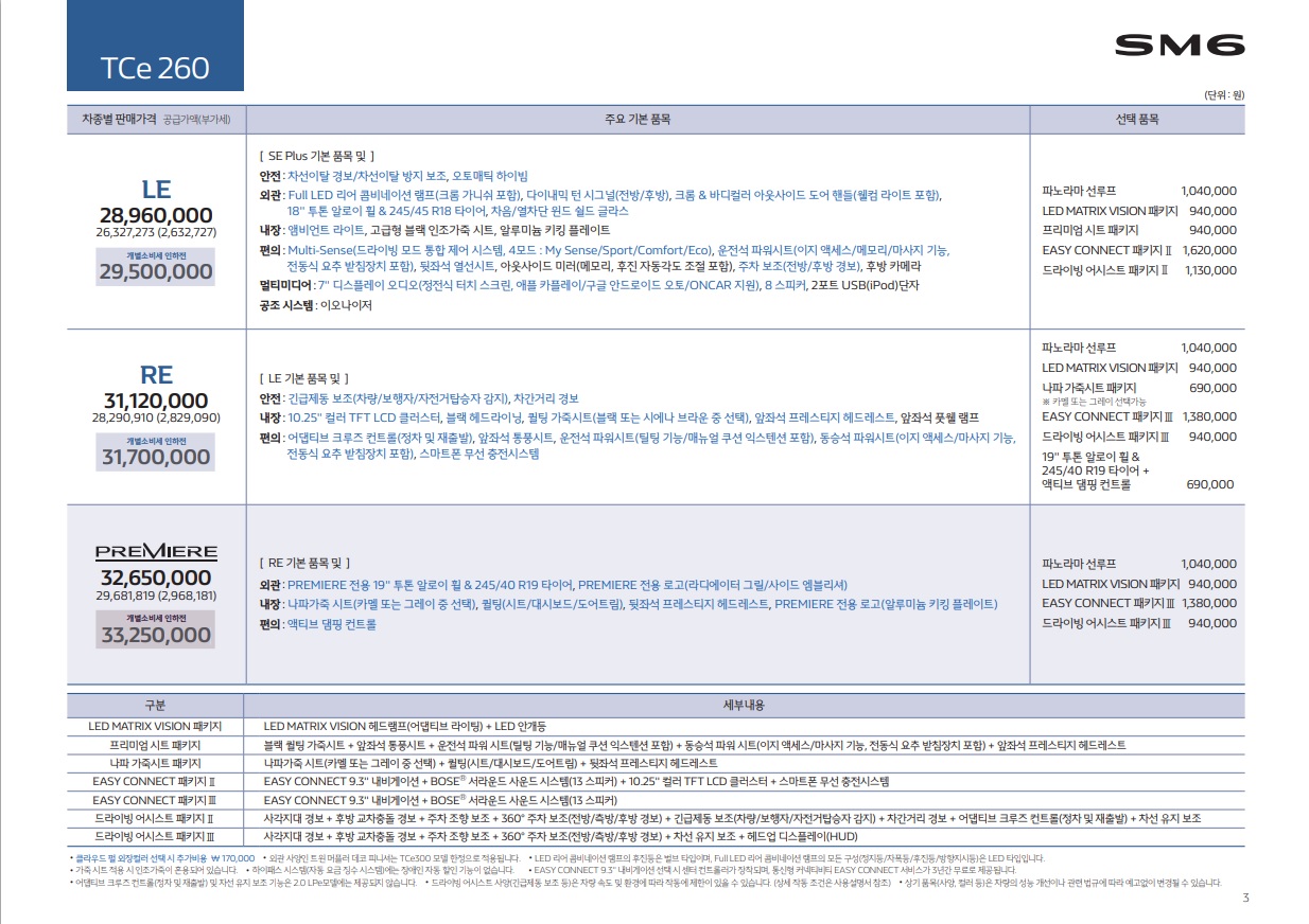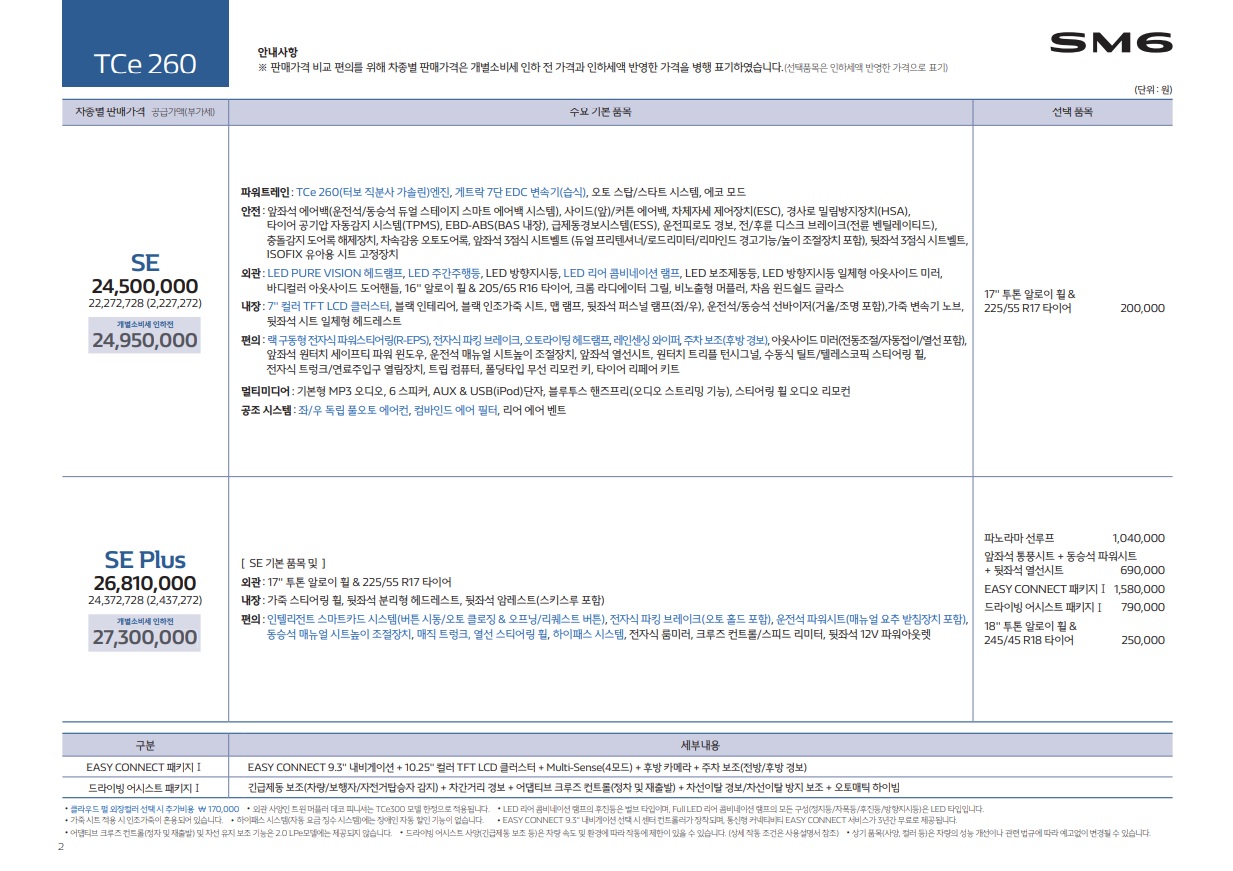 SM6 페이스리프트 모델의 판매 가격은 2401만 원~3422만 원으로 책정이 되었는데요. 자세한 가격은 아래의 가격표를 참고해주세요.