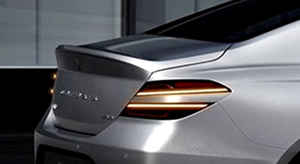 테일램프의 디자인은 제네시스 로고의 비상하는 날개 모형을 표현했다고 하는데요. 전면부와 흡사한 느낌의 쿼드 램프가 들어갔다는 것을 알 수 있습니다. 중앙에는 제네시스 로고가 적용되어 제네시스의 존재감을 느낄 수 있습니다.