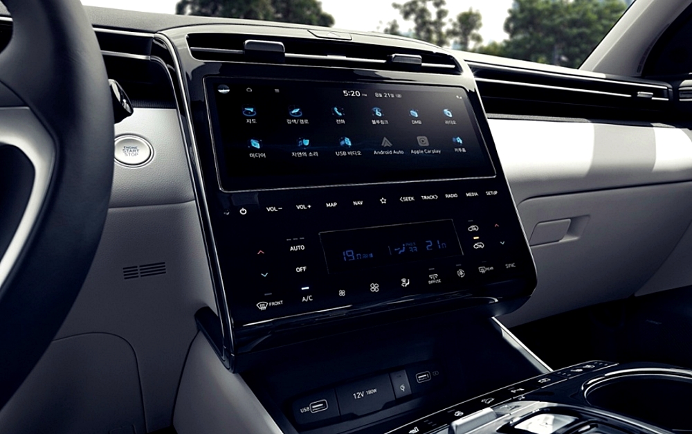 디스플레이의 경우 기존보다 더욱 커진 10.25인치 디스플레이(무선 업데이트, 블루투스 멀티 커넥션, 자연어 기반 음성인식, 아이 클라우드의 외부 캘린더 연동, 카페이, 카투홈 등 적용)를 사용하고 있으며, 통합된 일체형 공조기 버튼 등을 사용하여 미래지향적인 이미지를 추구하고 있습니다.