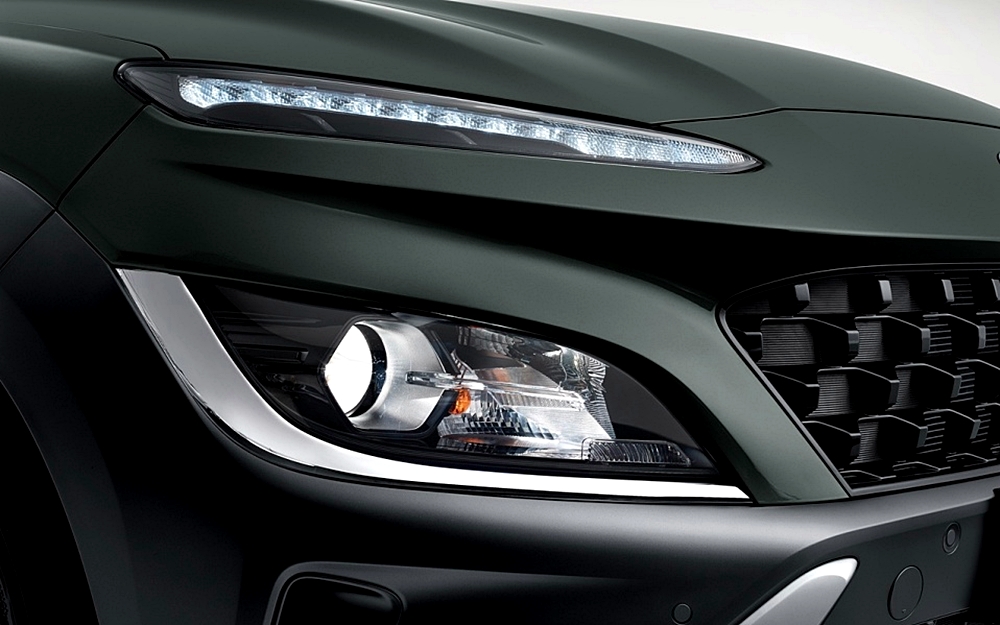 예리한 모습을 보여주는 후드 부위는 스포티한 느낌을 주고 있으며, 정교하게 다듬어진 라디에이터 그릴은 코나의 역동적인 느낌을 주기 충분합니다. 화가 난 느낌의 스키드 플레이트와 프런트 범퍼 모퉁이에 자리한 수직 구조의 에어 커튼은 스포티한 느낌으로 완성된 코나라는 것을 알 수 있습니다.