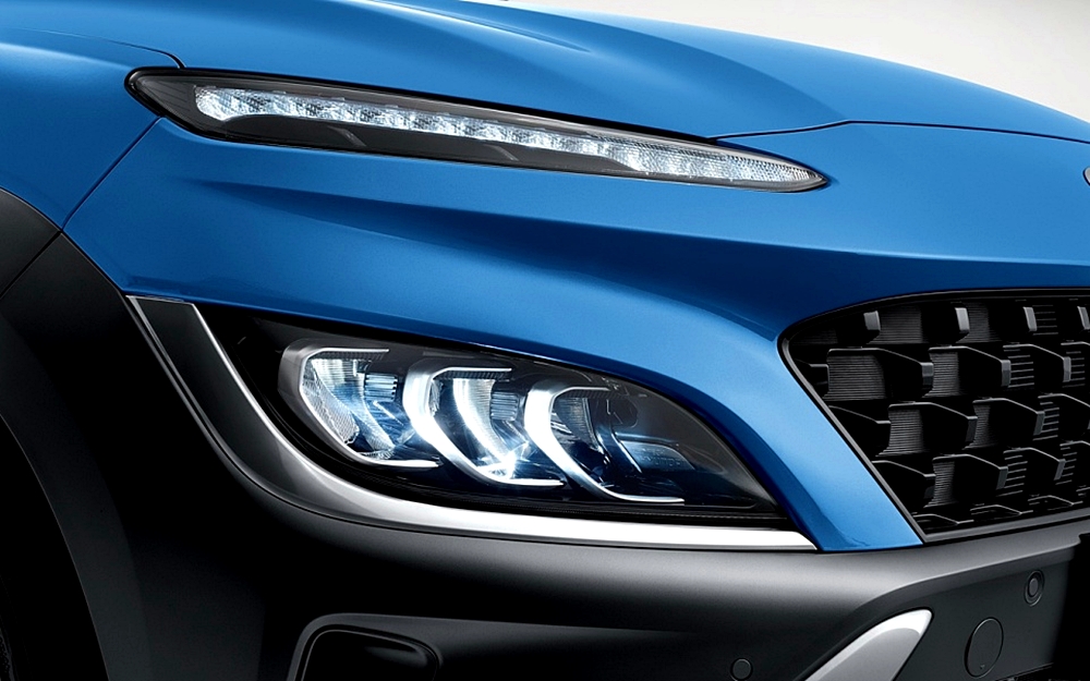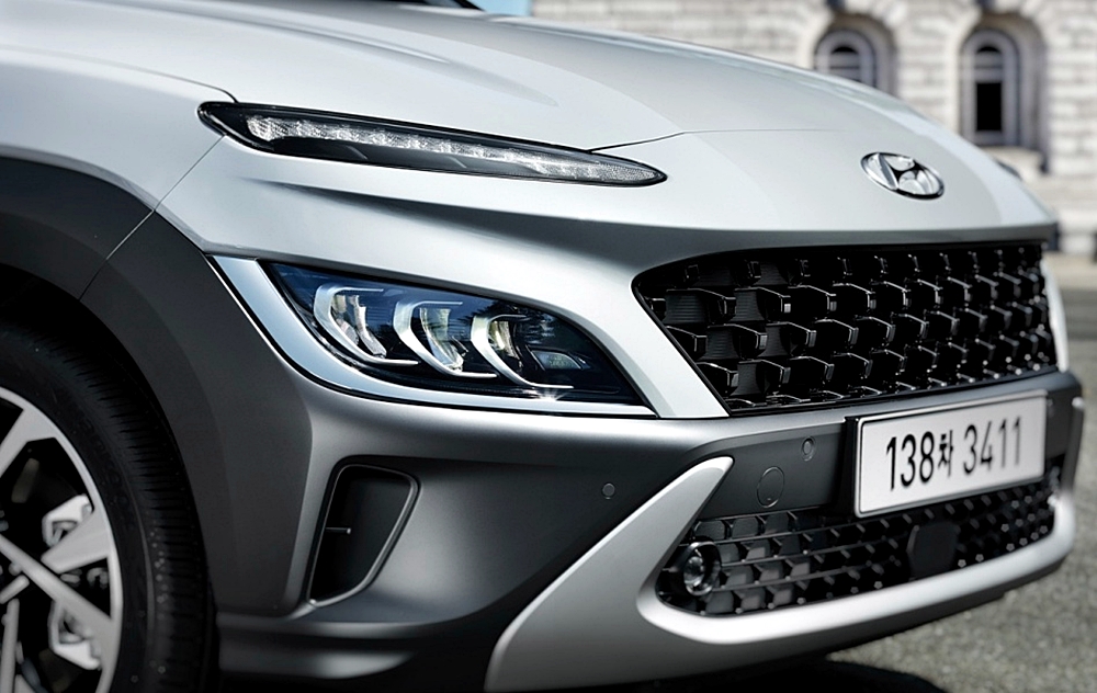 2021 더 뉴 코나의 디자인을 간단히 살펴보도록 하겠습니다. 전면부 디자인은 조금 더 세련된 느낌의 감성을 적용하여 날렵하고, 공격적인 느낌을 가지고 있습니다.