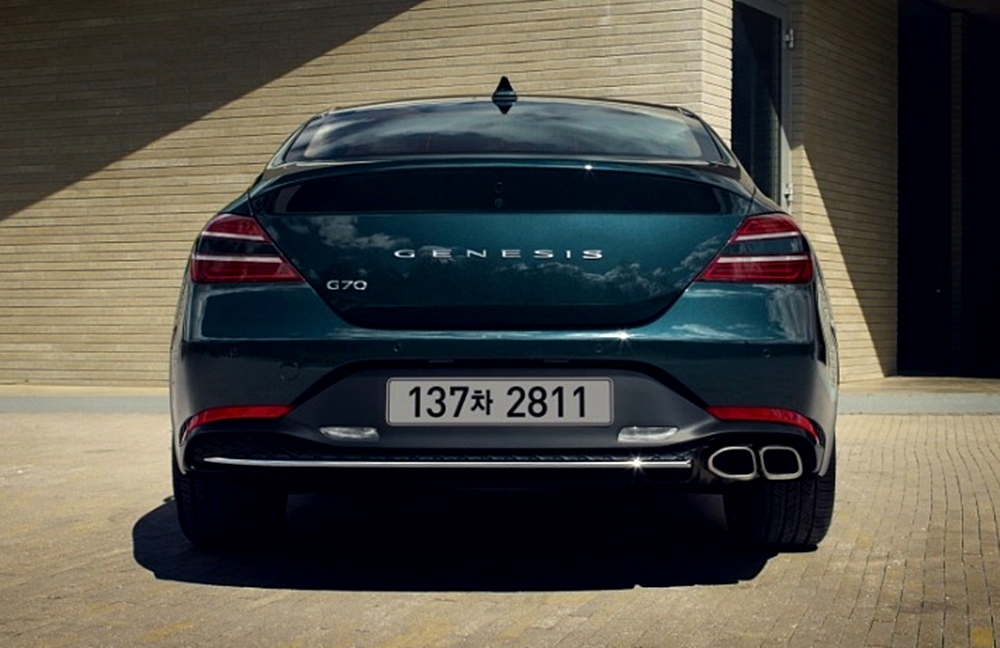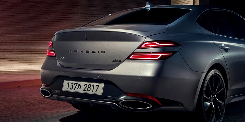 트렁크 리드 부분을 길게 하고, 트렁크 부분을 짧게 만들어 스포일러의 역할을 할 수 있게 디자인되었으며, 제네시스 레터링이 들어가 더욱 고급스러운 느낌을 줍니다. 듀얼 머플러는 스포츠 세단의 강력한 성능을 의미하는 느낌으로 제작이 되었으며, 리어 범퍼 하단에는 4핀 스타일의 스키드 플레이트 디자인을 통해 고성능 느낌을 더욱 살렸네요.