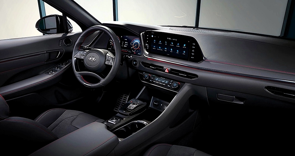 쏘나타 N라인의 실내 인테리어를 한번 살펴보도록 하겠습니다. 쏘나타 N라인의 실내는 기존의 쏘나타의 레이아웃을 유지하고 있지만, 중간중간 포인트를 넣어 고성능 자동차의 느낌을 잘 살리고 있습니다. 스티어링 휠과 도어 트림 그리고 시트에는 블랙 스티치를 통해 스포티한 감성을 자극하고 있으며, 전용 버킷 시트를 적용하였는데요.