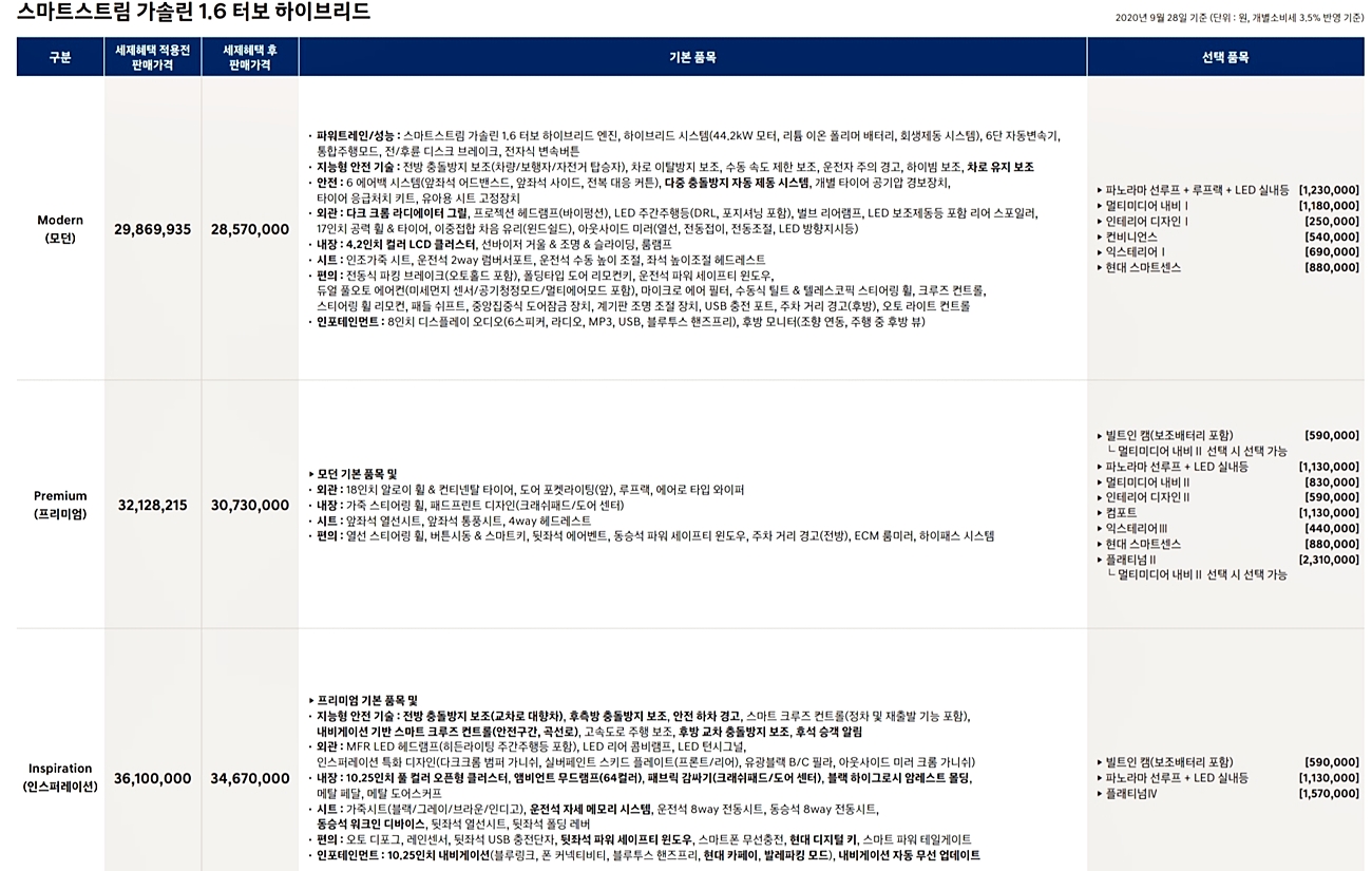 투싼 하이브리드 풀체인지 모델의 자세한 가격은 아래의 투싼 하이브리드 가격표를 참고하시면 도움이 될 것 같네요.