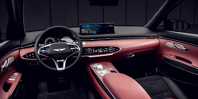 대시보드 상단으로 올라온 내비게이션의 경우 14.5인치라는 와이드 디스플레이가 적용되었는데요. 이런 디자인은 제네시스 G80에서도 본 듯한 느낌으로 고급스러운 느낌과 동시에 미래지향적인 차량의 느낌을 만나보실 수 있어요. 상당히 깔끔하면서도 광활한 인포테인먼트 시스템을 만나보실 수 있겠네요. 운전석 앞으로는 고급스러운 느낌의 2 스포크 스티어링 휠이 적용되었는데요. 중앙으로는 제네시스의 엠블럼이 자리하고 있어 실내를 더욱 고급스럽게 보이게 하네요.
